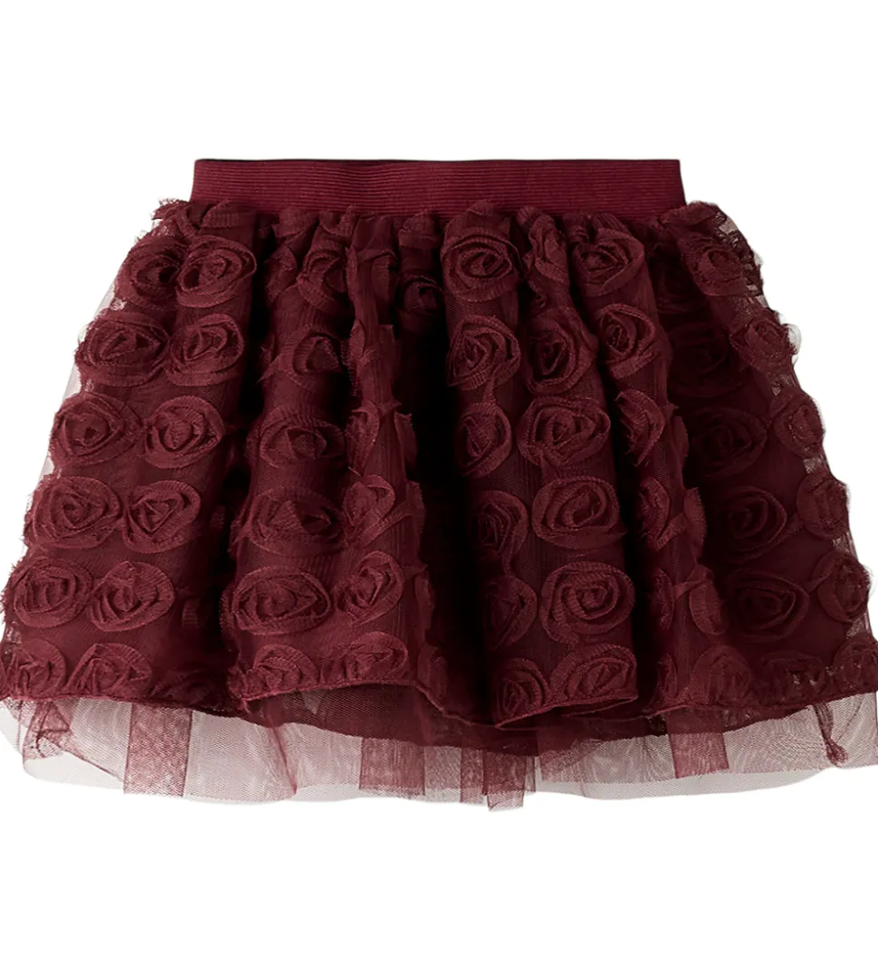 Flot Name It nederdel i bordeauxrødt tyl med elegant struktur, som ligner små roser. Nederdelen har en elastisk talje, og består af et lag genanvendt polyester inderst og flere lag tyl yderst.