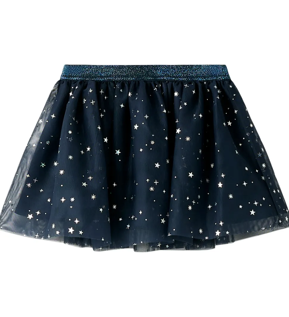 Elegant Name It nederdel i en mørkeblå nuance med et flot stjernemønster. Name It nederdelen har en skinnende, elastisk talje, der sikrer en behagelig pasform. Nederdelen har et let og luftigt design med et ekstra lag for et fyldigt look.