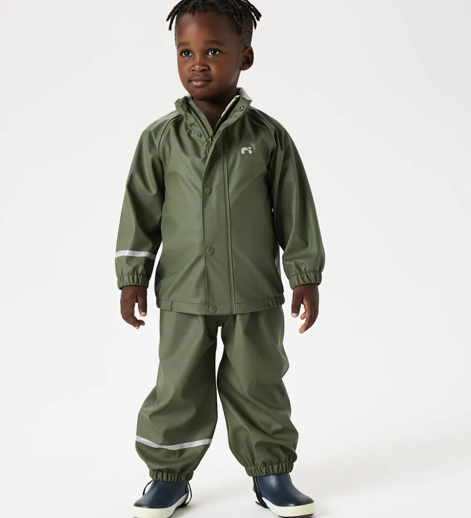Flot Name It regntøj af PU bestående af en regnjakke og et par regnbukser i mørkegrøn med et lille reflekslogo på venstre bryst og nederst på ryggen.