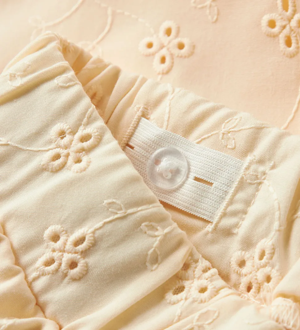 Charmerende Name It shorts i en lys, gul nuance med et delikat blomsterbroderi. Name It shortsene har en komfortabel elastik i taljen, der sikrer en god pasform.