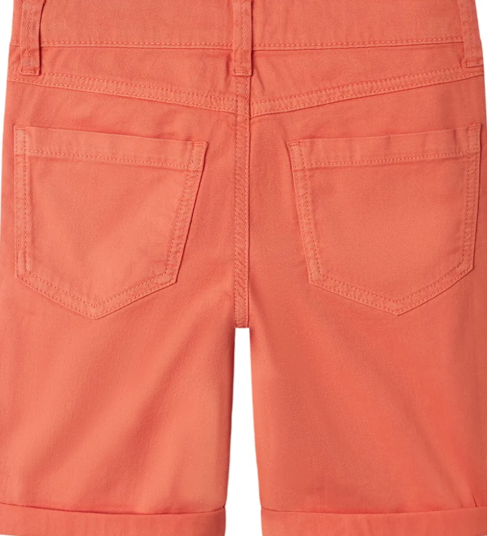Stilfulde Name It shorts i en frisk, orange farve. Shortsene har en klassisk design med knaplukning og bæltestropper. Taljen justeres indvendigt med knapper. Name It har inkluderet praktiske lommer foran og bagpå samt opsmøgede kanter, der giver et smart look.