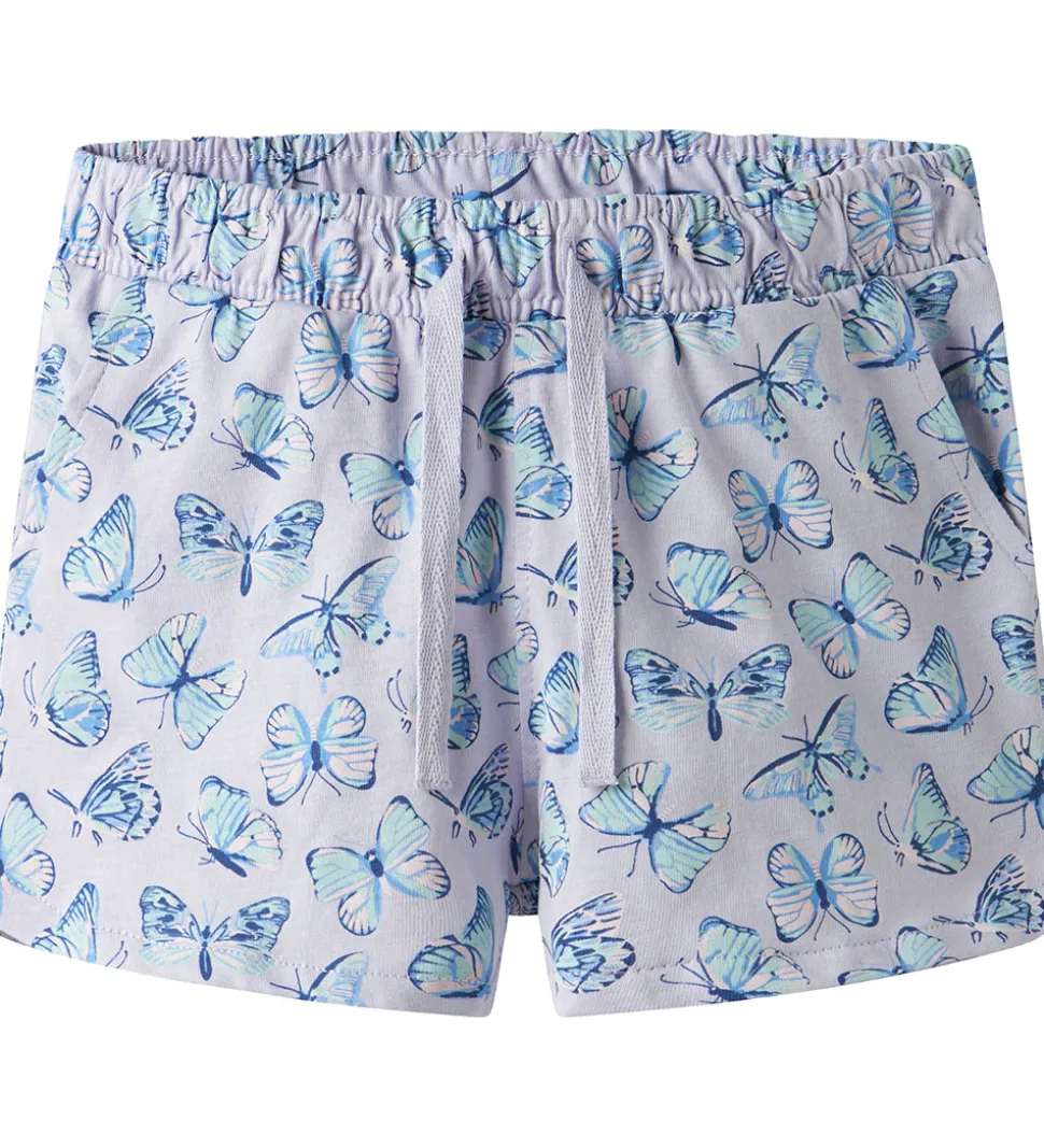 Seje Name It shorts i lilla med sommerfugleprint. Name It shortsene har en elastisk talje med dekorative snøre fortil og praktiske sidelommer.