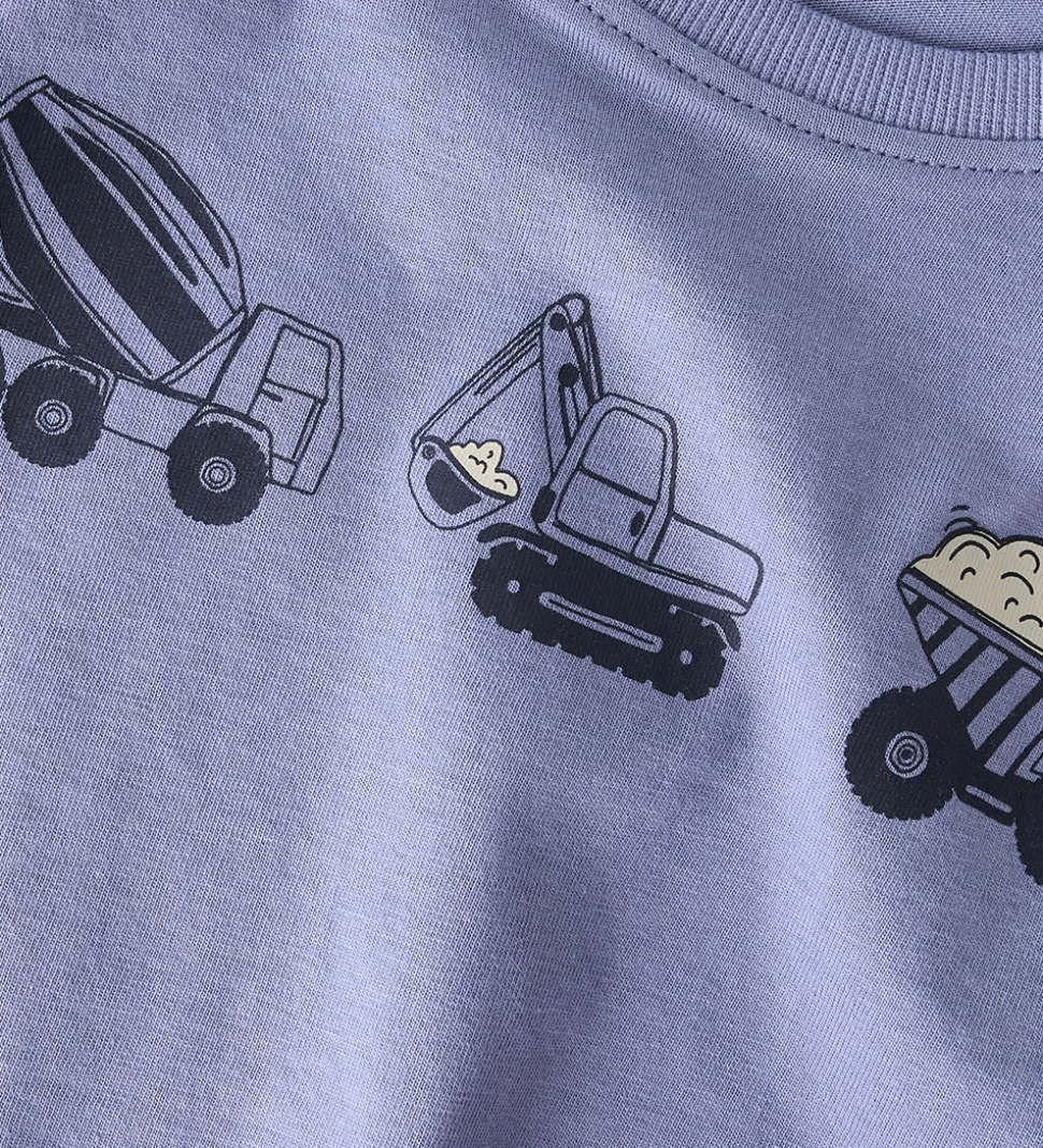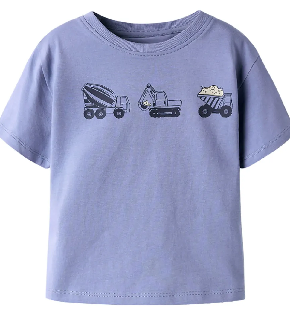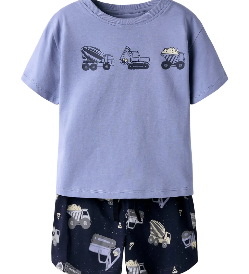 Smart Name It shortssæt bestående af en t-shirt og et par shorts. T-shirten er støvet blå med et print fortil af tre arbejdsmaskiner. Shortsene har et livligt print af forskellige køretøjer i lyse farver på en navy baggrund.