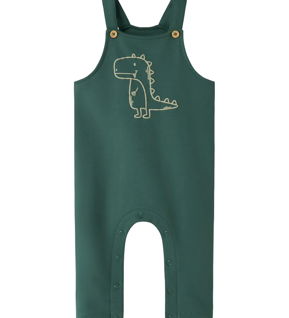 Charmerende Name It smækbukser i mørkegrøn sweat med et enkelt dinosaurprint foran.
