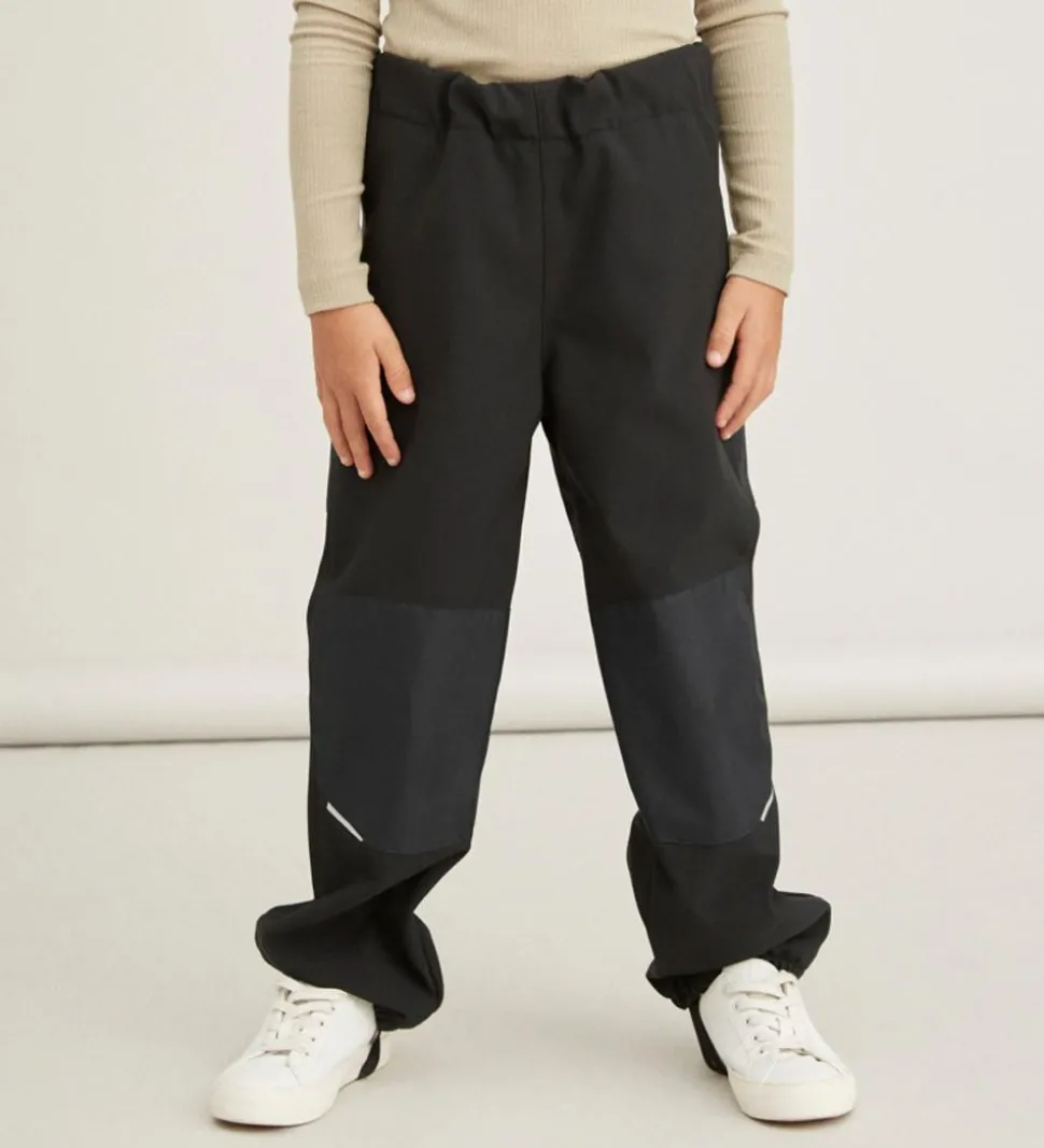 Smarte Name It softshellbukser i sort, med reflekser både fortil og bagpå.
