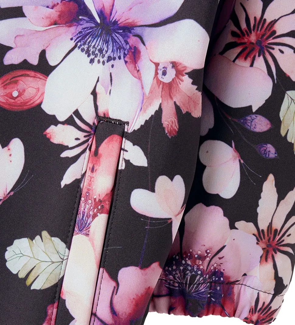 Dejlig Name It softshelldragt i sort med et alloverprint af blomster og sommerfugle i rosa, lilla og grønne nuancer.