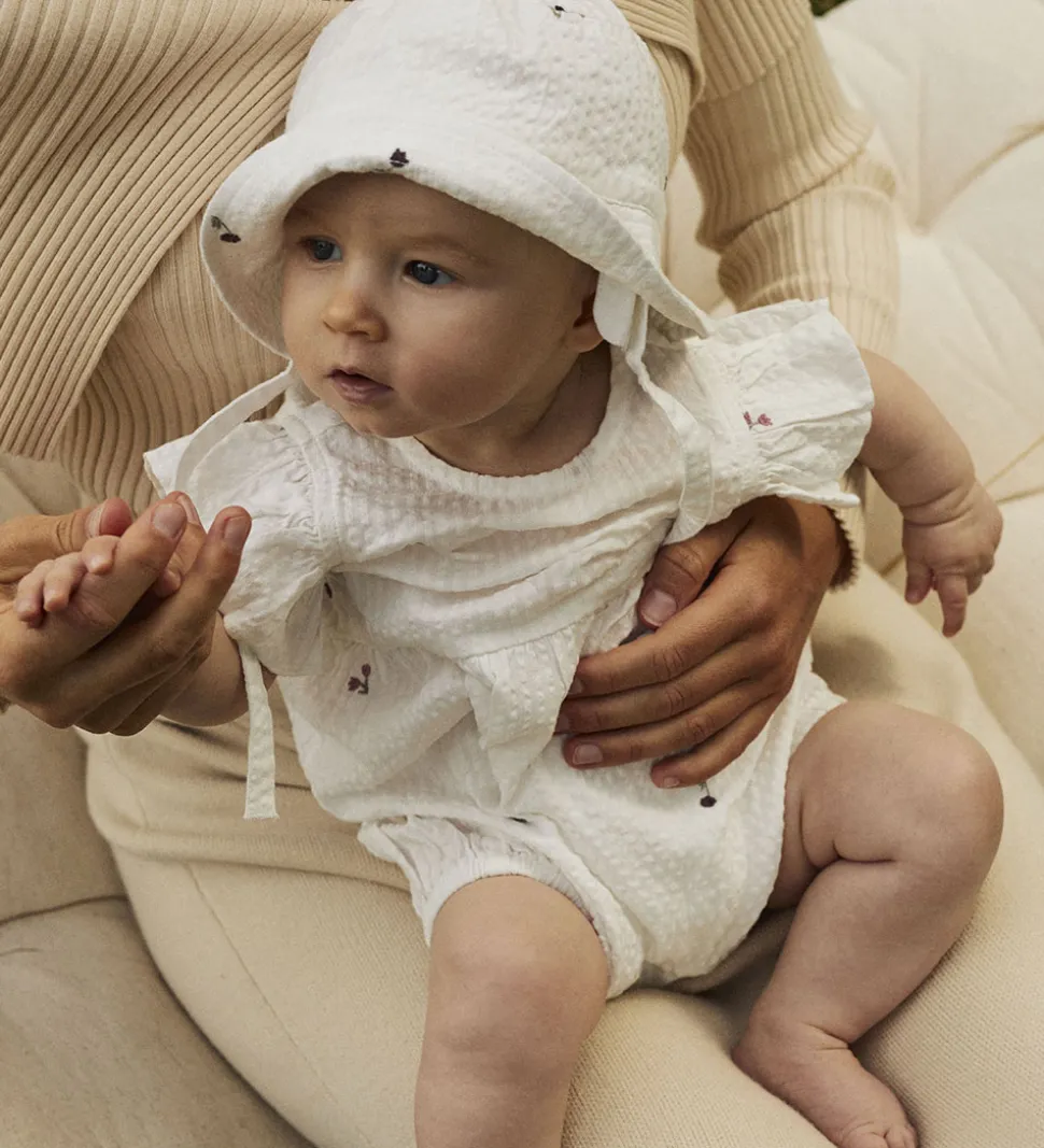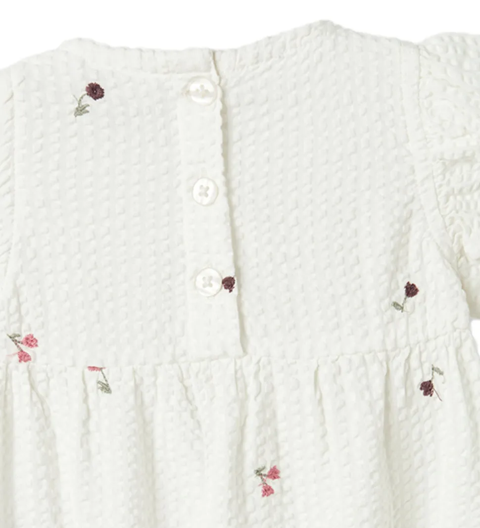 Fin Name It sommerdragt i hvid bæk og bølge med små, broderede blomster i rosa og mørk lilla. Sommerdragten er designet med korte ærmer med flæser og en rund halsudskæring, som lukkes med knapper i nakken. Den har korte ben med elastikkanter og trykknapper mellem benene.