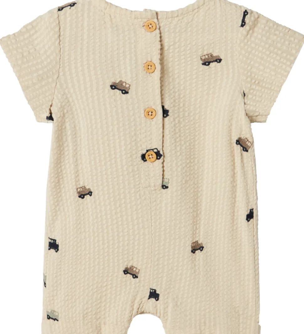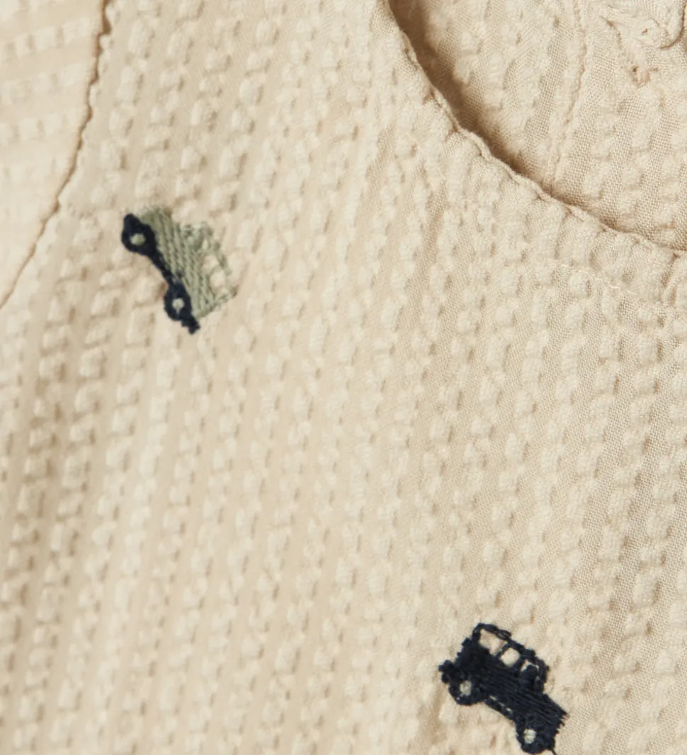 Dejlig Name It sommerdragt med korte ærmer i en beige nuance med en fin struktur i stoffet. Name It sommerdragten har et sjovt print af små biler i varierende farver, der giver et legende udtryk. Sommerdragten åbens med praktiske trykknapper.