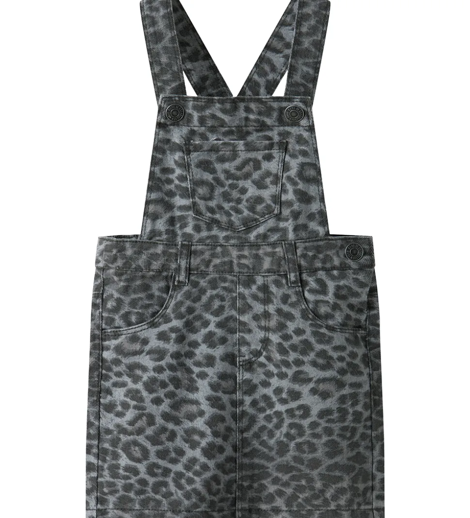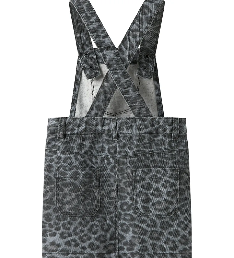 Stilfuld Name It spencer i denim med leopardprint i grå nuancer. Name It spenceren har en klassisk overalls-stil med seler, som knappes på foran. Selernes kan knappes i to længder. Derudover er der en knap i venstre side af taljen, som gør det let at få spenceren af og på. Foran er der en brystlomme og to lommer i siderne. Bagpå er der to baglommer.