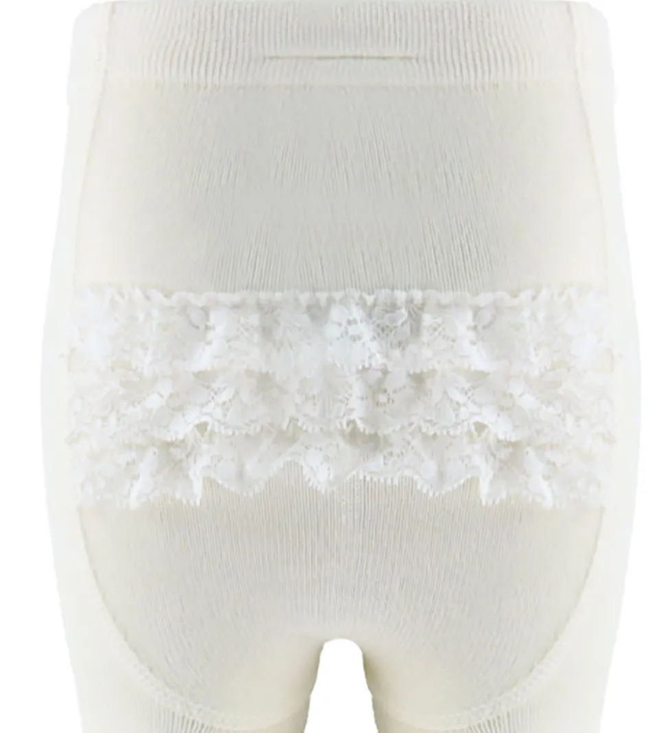 Klassiske Name It strømpebukser i en enkeltstående sampakning. Strømpebukserne kommer i en ensfarvet, hvid nuance og har rækker af blonder bagpå. Name It strømpebukserne har elastik i livet for en god pasform.
