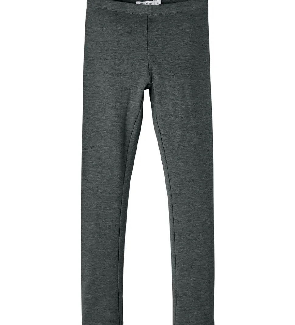 Behagelige Name It leggings i en ensfarvet mørkegrå nuance. Name It leggingsene er lavet i et kraftigt, strækbart materiale med en elastisk talje, der sikrer en god pasform. Indvendigt har leggingsene blødt børstet bomuld, som gør der dejligt bløde mod huden.