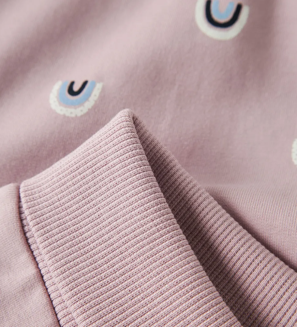 Fine Name It sweatpants i rosa med print af små regnbuer. Sweatpantsene har en elastisk ribkant i livet og ved anklerne, der giver en behagelig pasform.