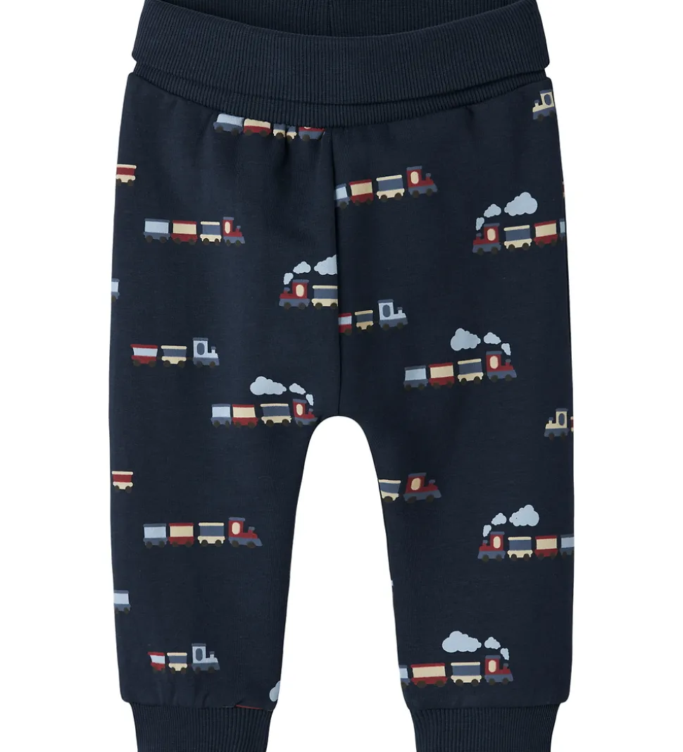 Lækre Name It sweatpants i navyblå med et alloverprint af toge i forskellige farver. Sweatpantsene har en bred ribkant i taljen, som kan bukkes ned. I benåbningerne er der ribkanter, og indvendigt er der blødt, børstet bomuld.