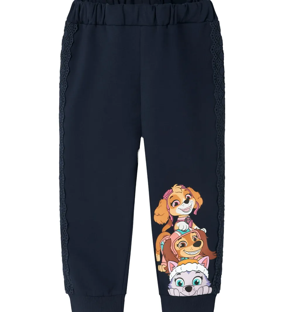 Charmerende Name It sweatpants i en dyb, marineblå farve med et farverigt print af tre Paw Patrol-figurer nederst på benet.