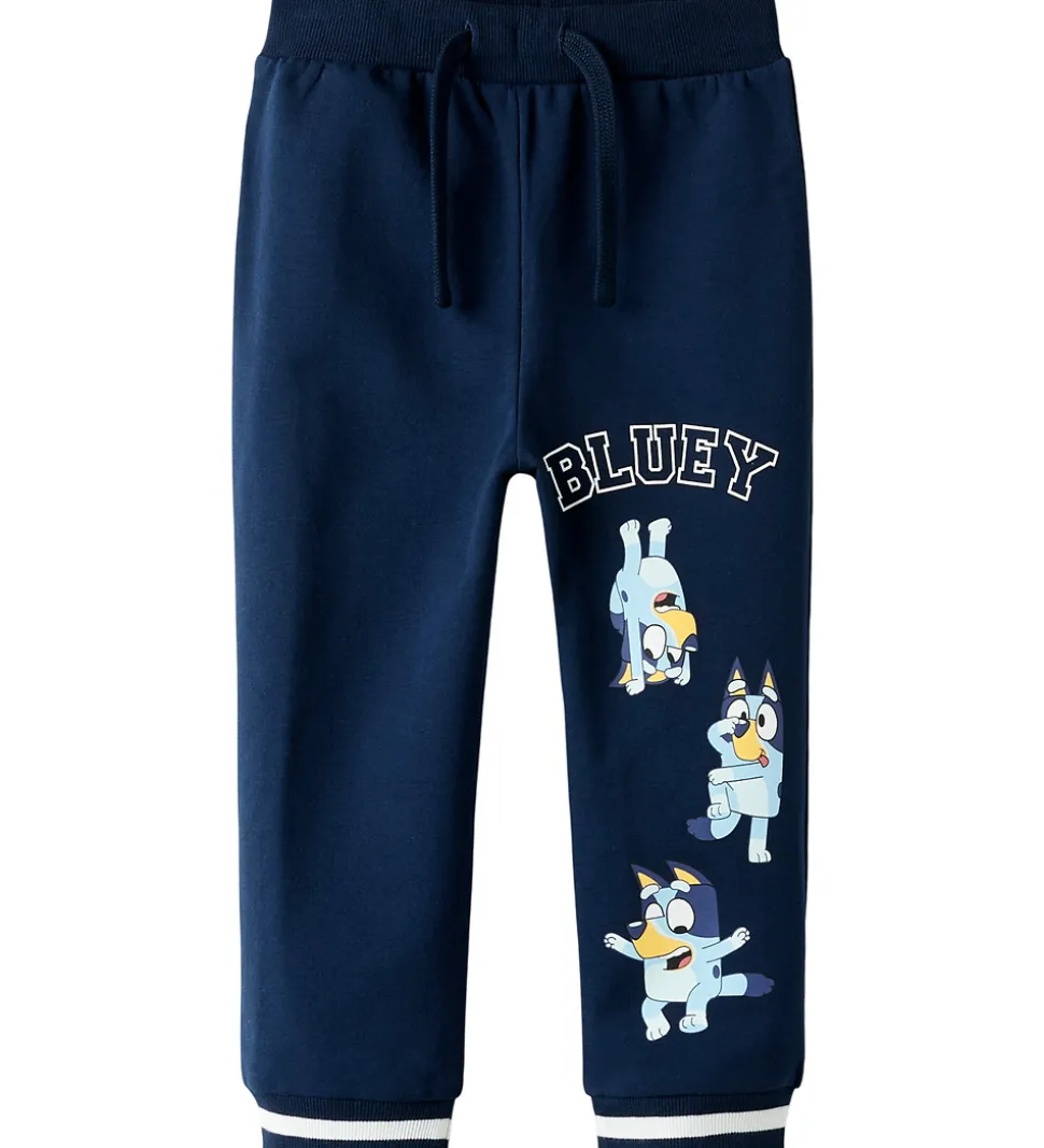 Smarte Name It sweatpants i en dyb, blå farve med et sødt Bluey-print på benet. Sweatpantsene har en elastisk linning med justerbare snører, som sikrer en behagelig pasform. Ribkanten ved anklerne afslutter designet på en enkel måde.
