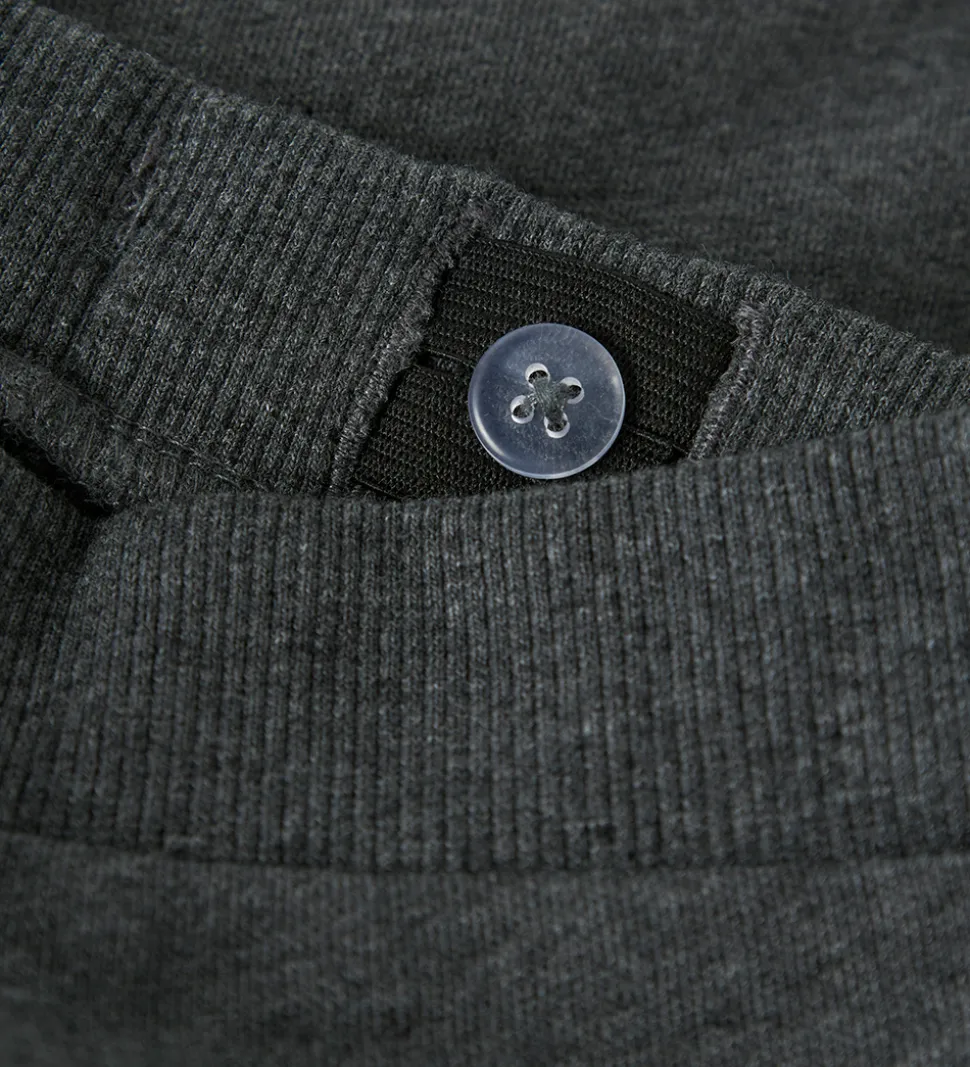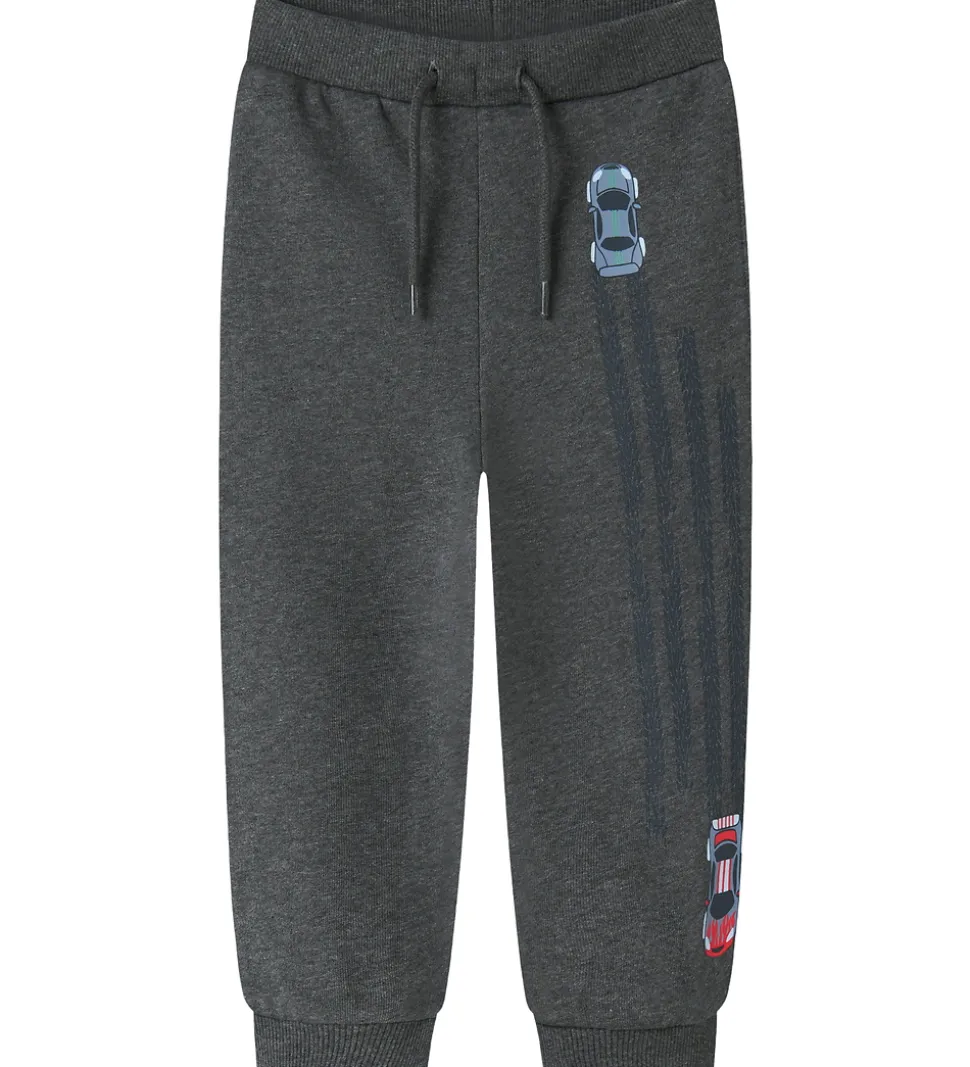 Seje Name It sweatpants i meleret mørkegrå med print af hjulspor og to racerbiler på det ene ben. Sweatpantsene har en god elastik i livet, som kan justeres med knapper indvendigt. Fortil er der dekorative snører og lommer i siderne. I benåbningerne er der ribkanter, og indvendigt er der blødt, børstet bomuld.