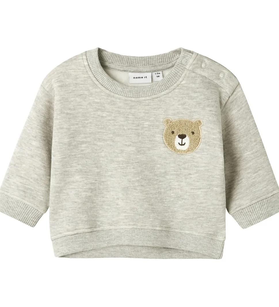 Charmerende Name It sweatshirt i meleret, lys beige med et sødt bjørnehoved i frotté på venstre bryst. Name It sweatshirten har en rund halsudskæring, lange ærmer og praktiske trykknapper ved venstre skulder. Indvendigt er der blødt, børstet bomuld.