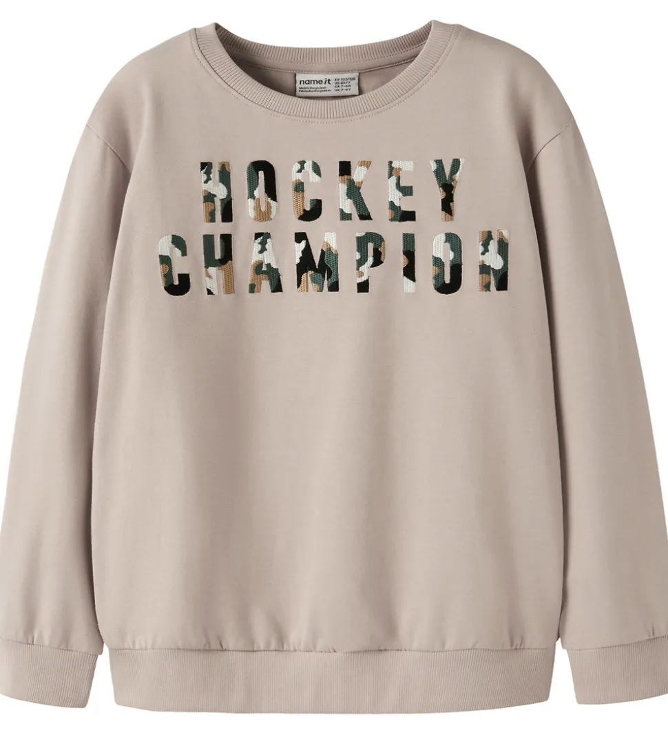 Smart Name It sweatshirt i en lysebrun nuance med teksten “Hockey Champion” på forsiden i camouflageprint. Sweatshirten har lange ærmer og en rund halsudskæring. Den har ribkanter ved alle åbninger, og indvendigt er der blødt, børstet bomuld.