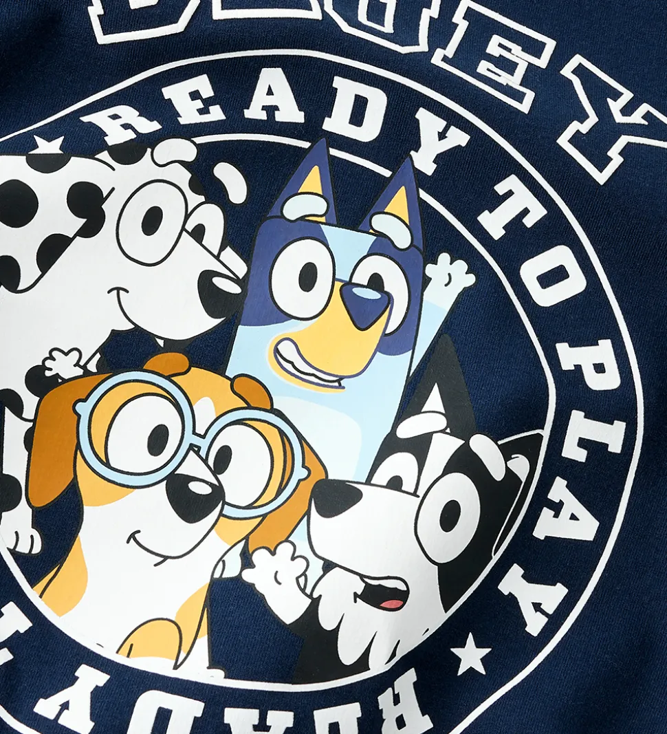 Skøn Name It sweatshirt i navyblå med et stort, farverigt Bluey-print foran. Sweatshirten har ribkanter med hvide kontraststriber ved hals-, ærme- og taljeåbning. Indvendigt er de blødt, børstet bomuld.