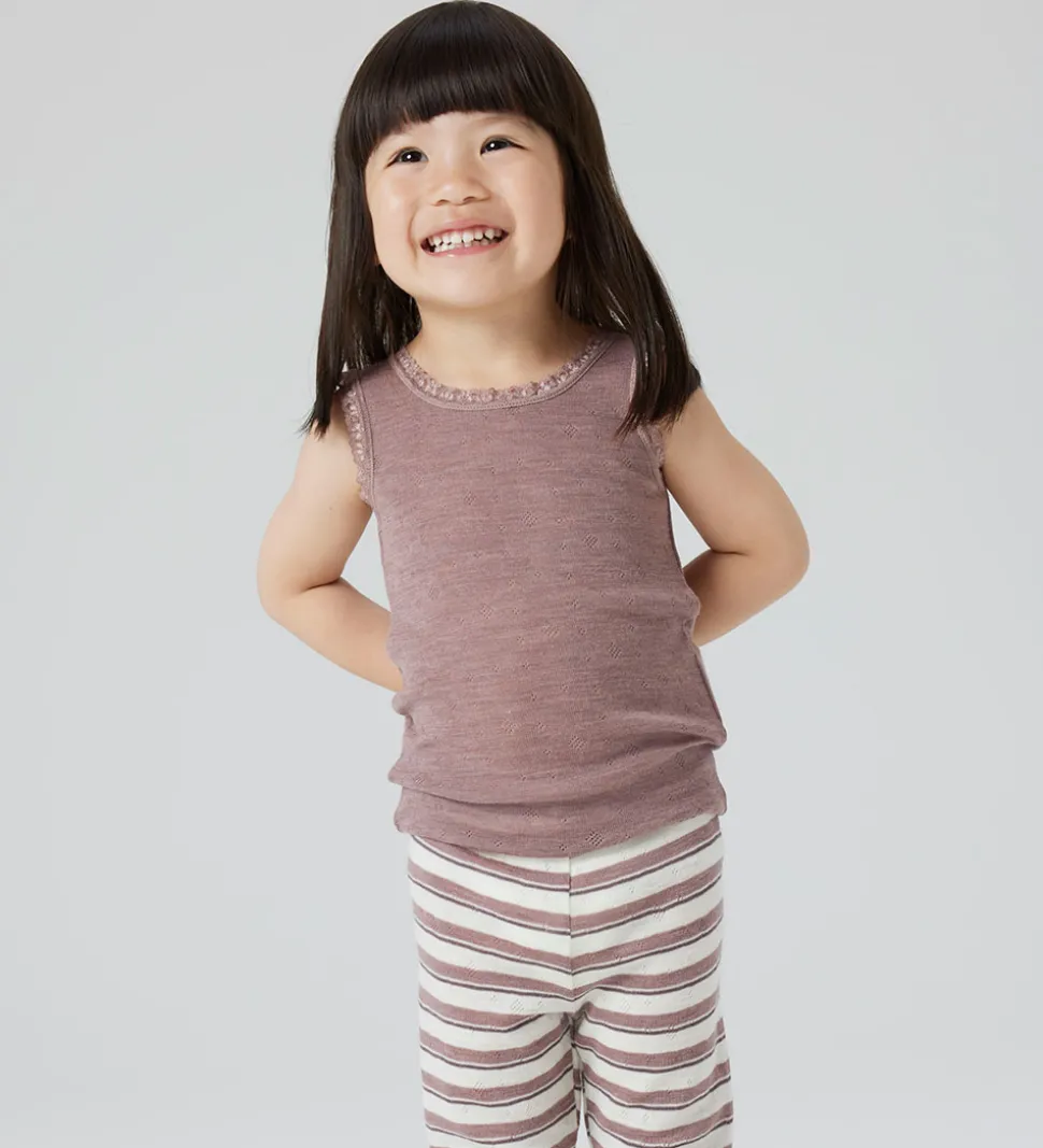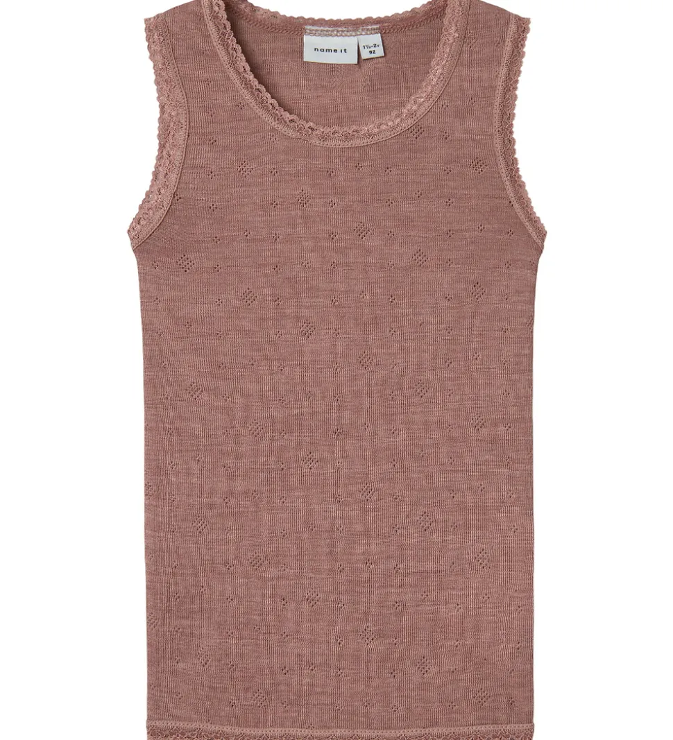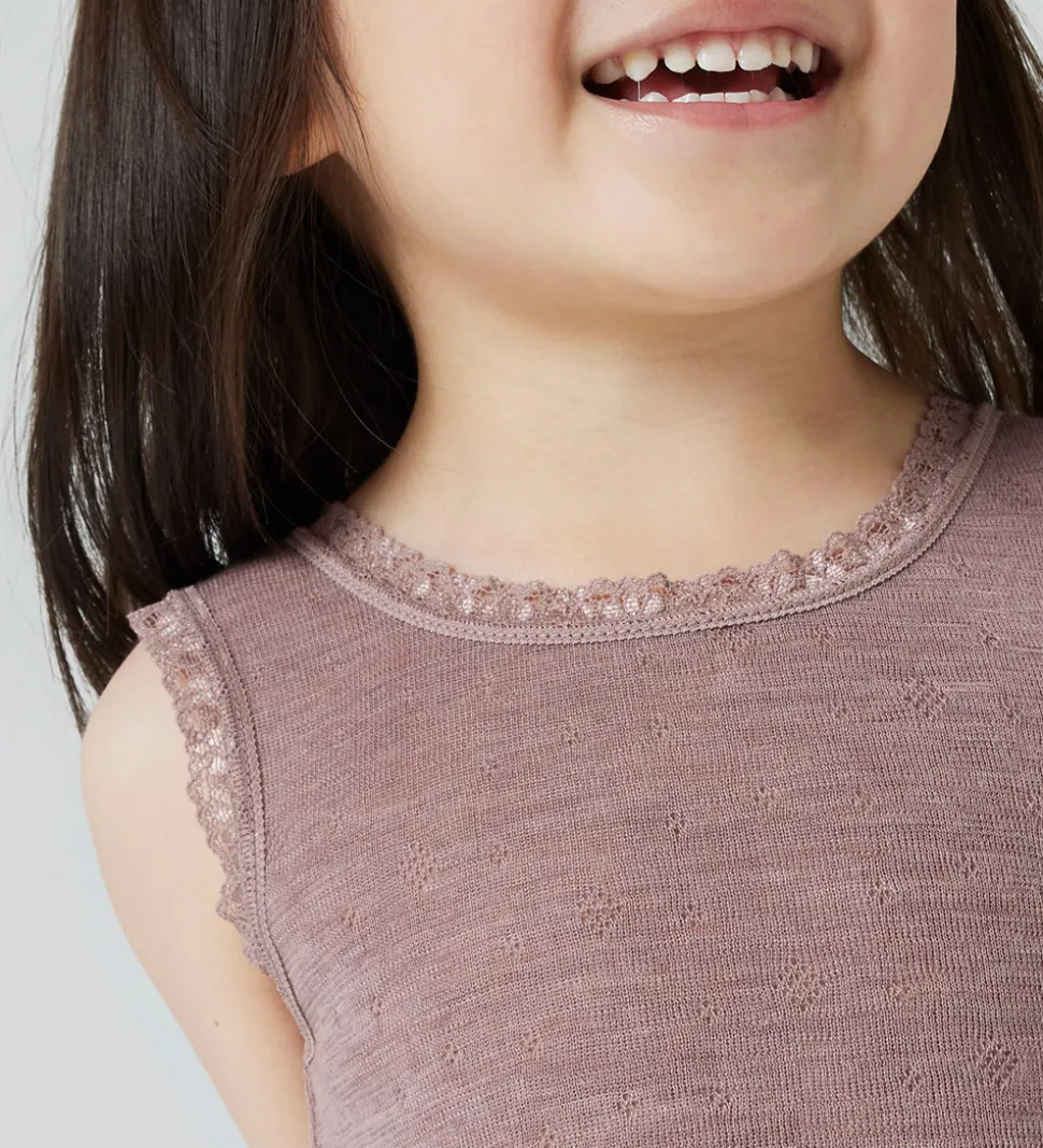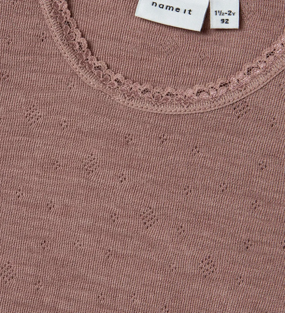 Skøn Name It undertrøje i støvet lilla med fint hulmønster og blondekanter i hals- og ærmeåbninger. Undertrøjen har en rund halsudskæring og brede skulderstropper. Den er fremstillet i blødt og åndbart merinould.