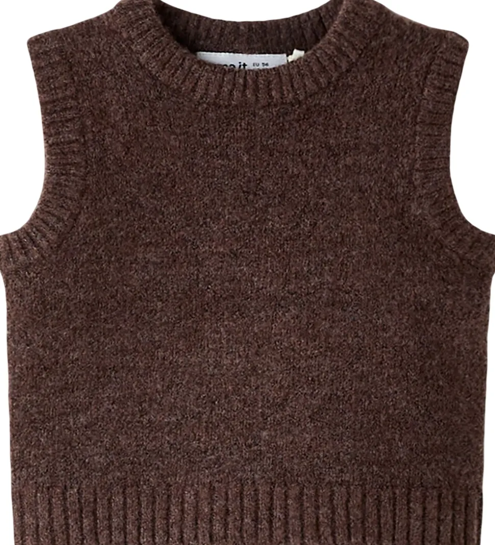 Stilfuld Name It vest i en flot brun nuance. Vesten har strikket struktur uden ærmer og ribkanter langs åbningerne.