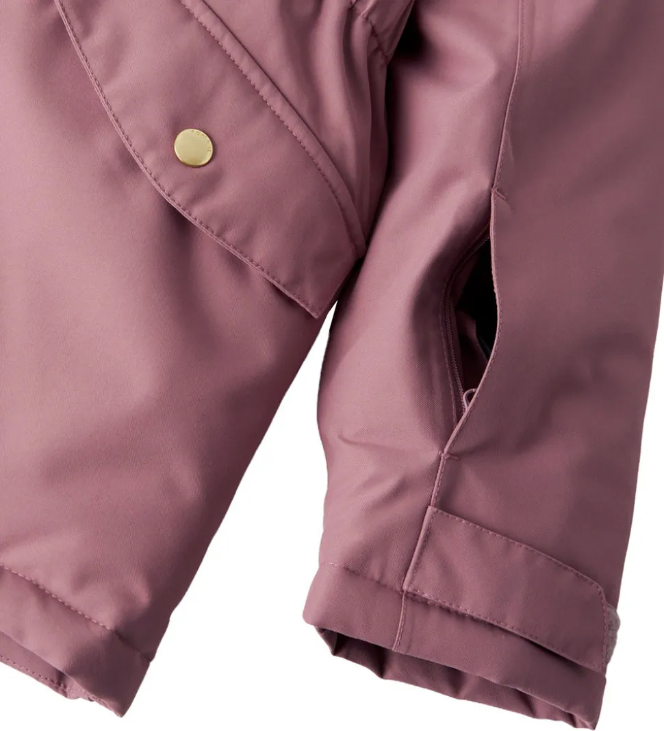 Name It vinterjakken har en aftagelig hætte, som sidder fast med skjulte trykknapper omkring halskraven, og pelskanten kan tages af og på ved hjælp af små knapper, og på indersiden er der en elastikkant, så hætten sidder godt til hovedet. Ærmerne har praktiske snefang med et hul til tommelfingeren, og ærmekanterne kan strammes ind med velcro. Omkring livet, indvendigt, er der et praktisk snefang med gummi, som lukkes med to trykknapper, samt er der elastik i taljen så den sidder godt til. Vinterjakken er godt vatteret, og indvendig har den et glatvævet for.