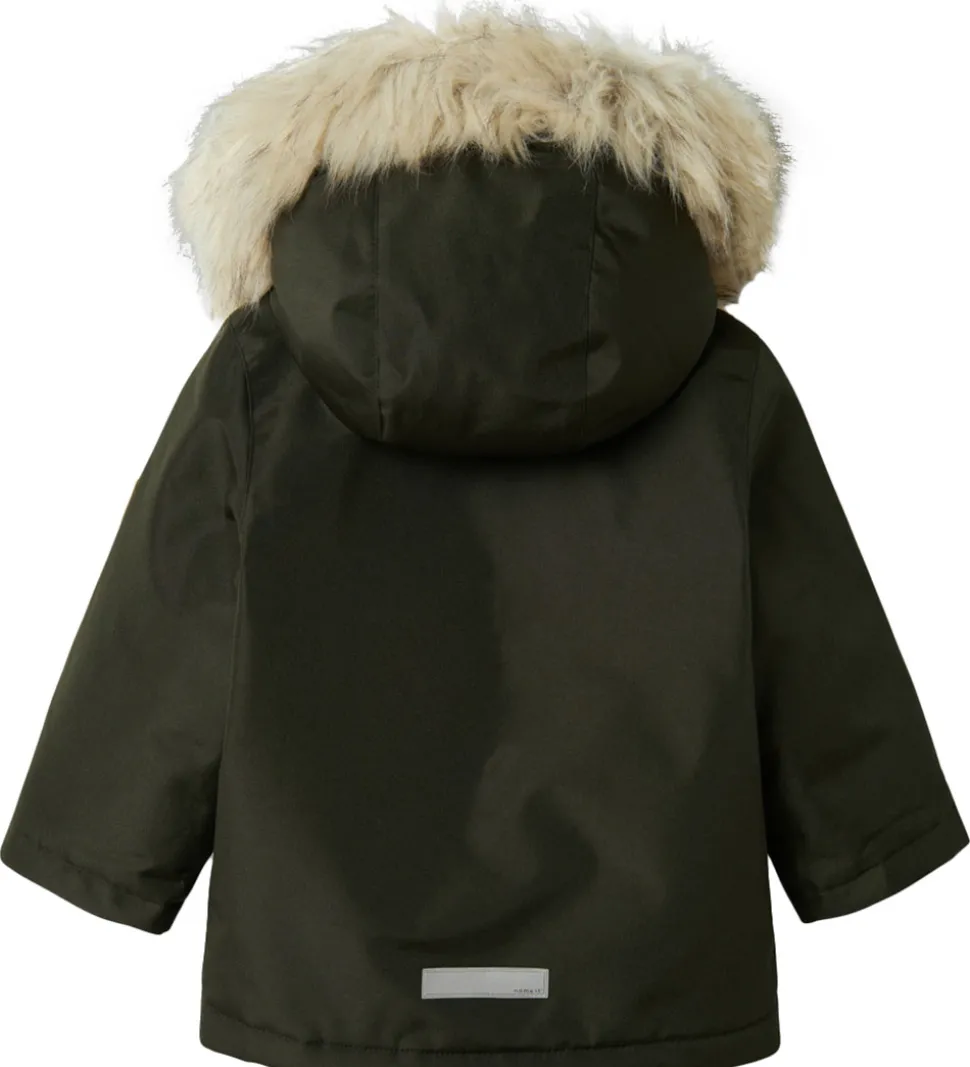 Dejlig Name It vinterjakke i dyb mørkegrøn med en lækker kant af imiteret pels på hætten.