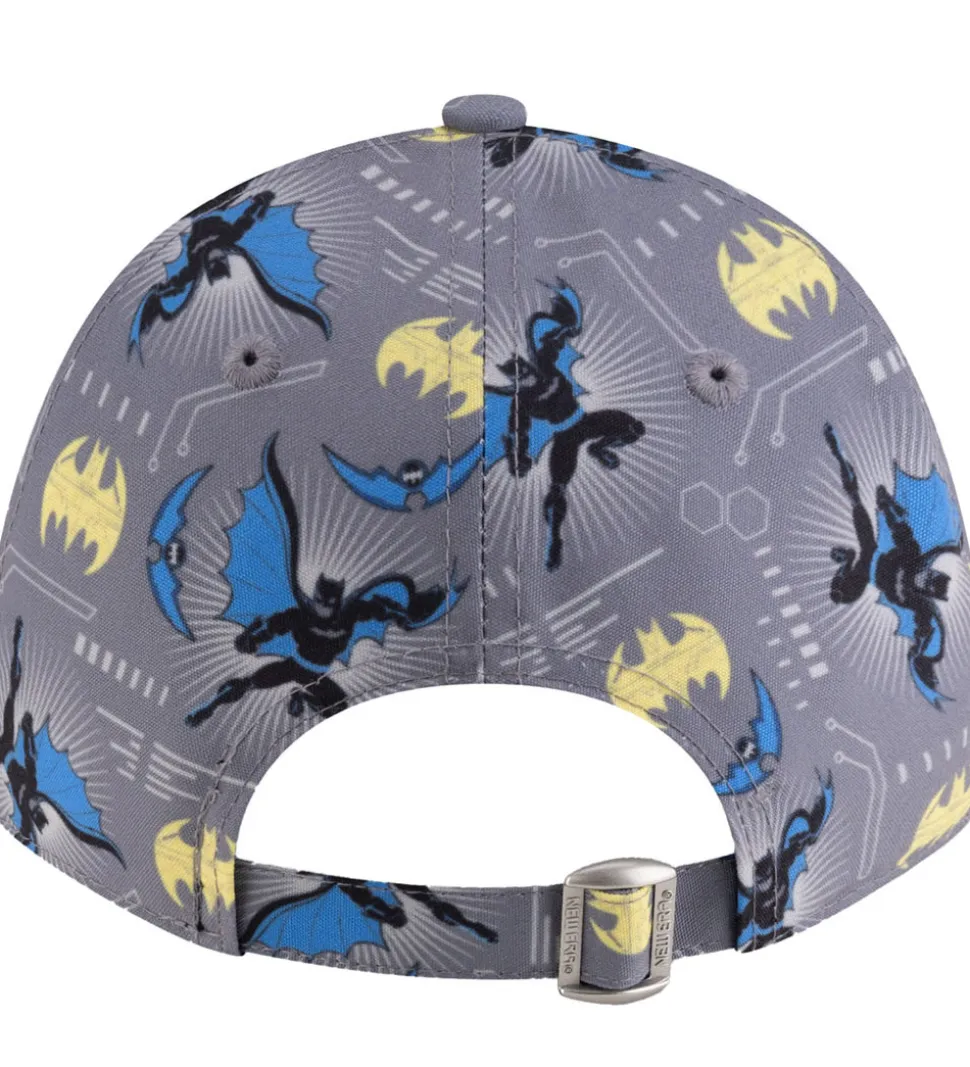 Sjov New Era kasket i grå med et sejt Batman print med detaljer i blå og gul, der dekorerer hele overfladen. I venstre side er der også et broderet New Era logo. Kasketten har en moderne form og er perfekt til fans af superhelten.