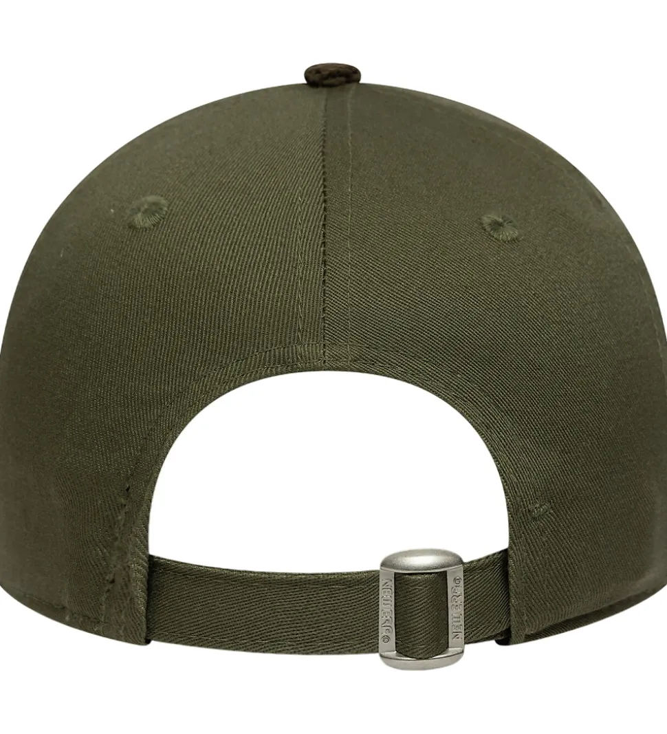 Sej New Era kasket i olivengrøn med et markant broderet badge foran, der viser et bjergmotiv med teksten “New Era Outdoor”. Kasketten har en skygge med plys på toppen.