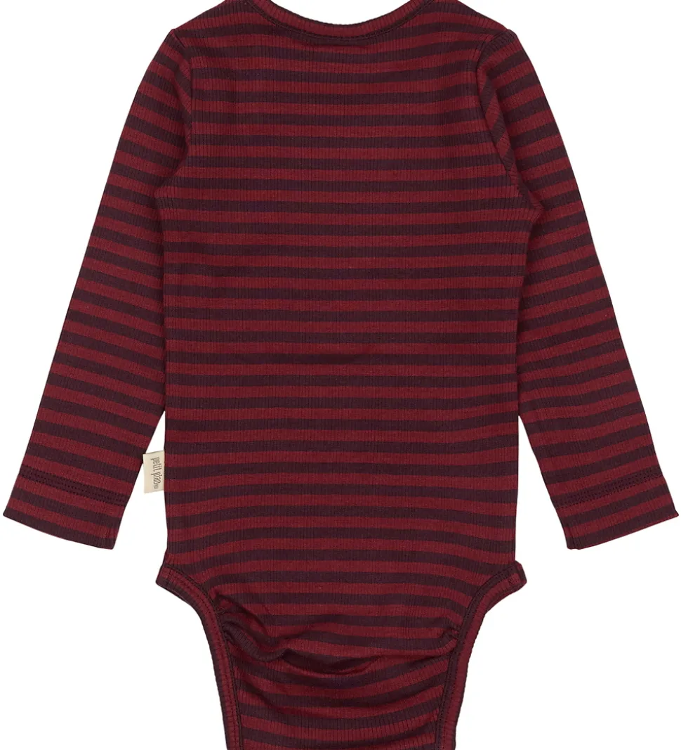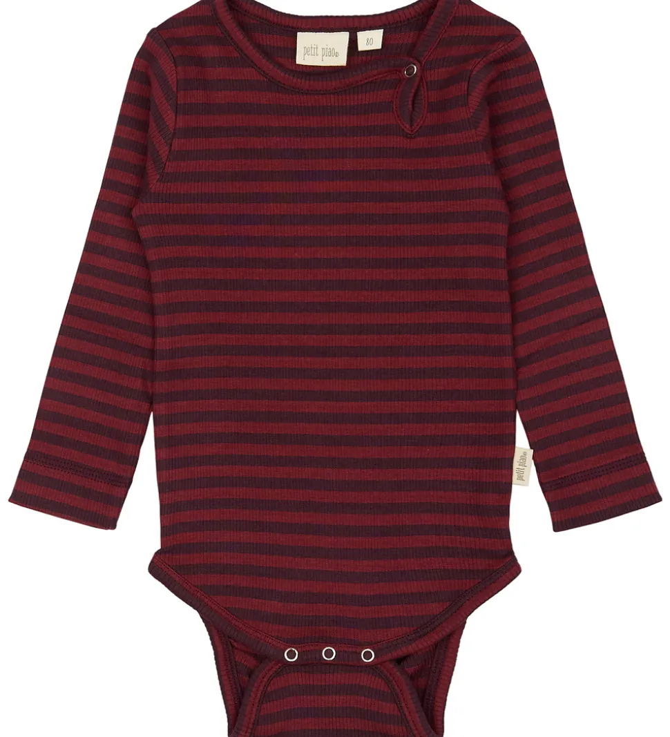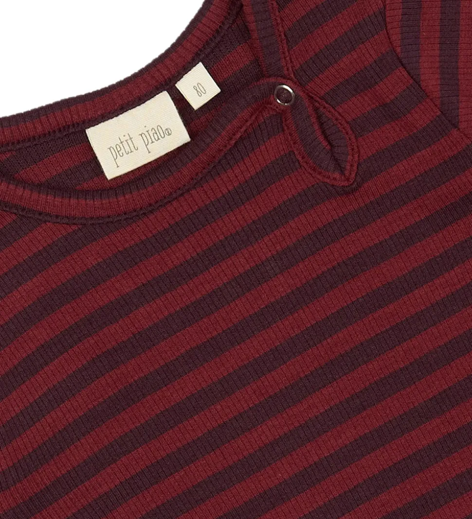 Attraktiv Petit Piao body med lange ærmer i et klassisk, stribet mønster i nuancer af rød og mørkebrun. Den bløde ribstruktur giver en behagelig pasform, og de ensartede striber tilføjer et stilrent udtryk.