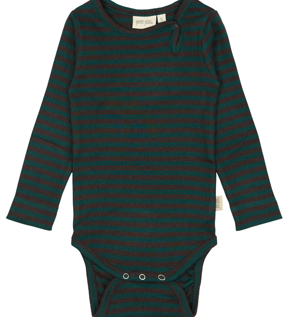Stilfuld Petit Piao body med lange ærmer i et klassisk, stribet mønster i mørkegrønne og brune nuancer. Bodyen har en fin rund hals og en praktisk lukning ved skulderen. Petit Piao sikrer en god pasform med ribkanter ved ærmerne og i bunden, og lukkes let med trykknapper forneden.