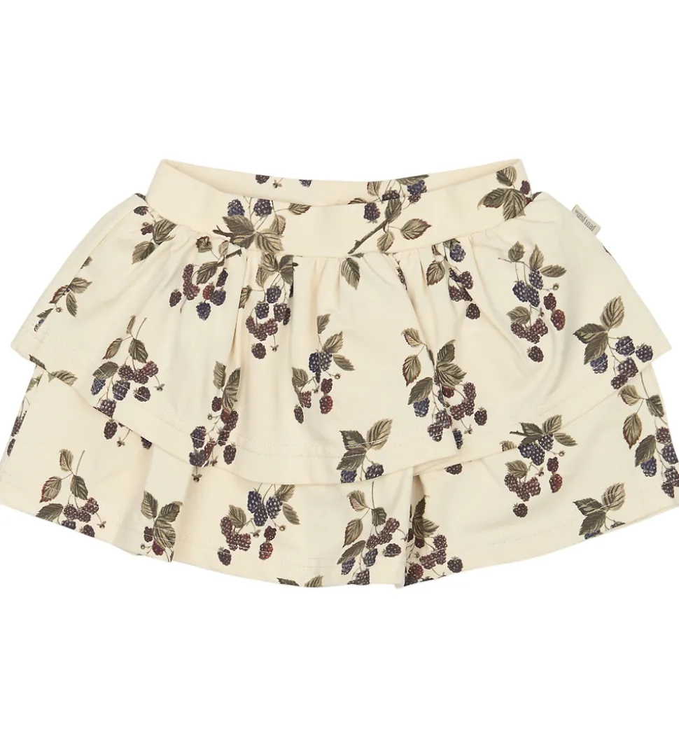 Elegant Petit Piao nederdel med et flot brombærprint på en cremefarvet baggrund. Nederdelen har en lagdelt struktur og elastik i taljen, som sikrer en god pasform. Petit Piao tilbyder her en stilfuld nederdel med et charmerende mønster.