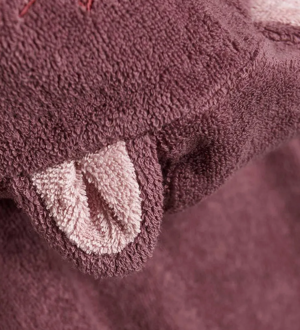 Sød Pippi Baby badekåbe i mørkerosa, med en fastsyet hætte med to ører og et broderet katte-ansigt.