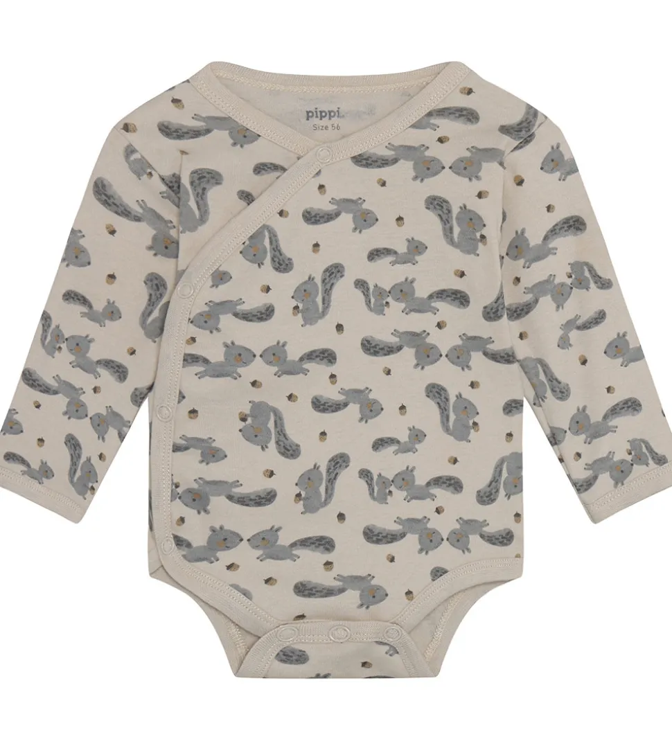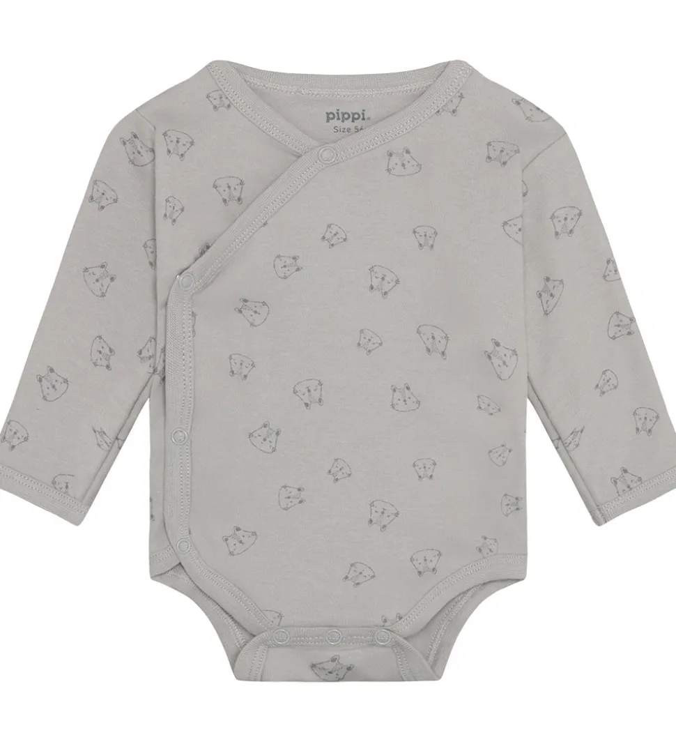 Pippi Baby bodyerne har lange ærmer med smalle ribkanter omkring alle åbninger. Bodyerne har et praktisk slå-om design med trykknapper ned langs begge sider. I bunden lukkes bodyen med tre praktiske trykknapper.