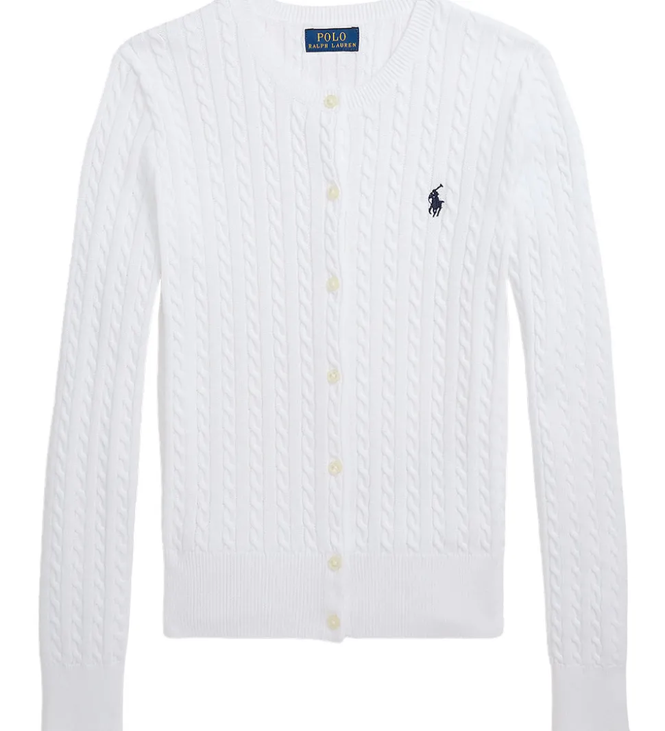 Fin Polo Ralph Lauren cardigan i hvid i en strikket kvalitet med et flot, snoet mønster, og i venstre side er der broderet et lille, navy logo.