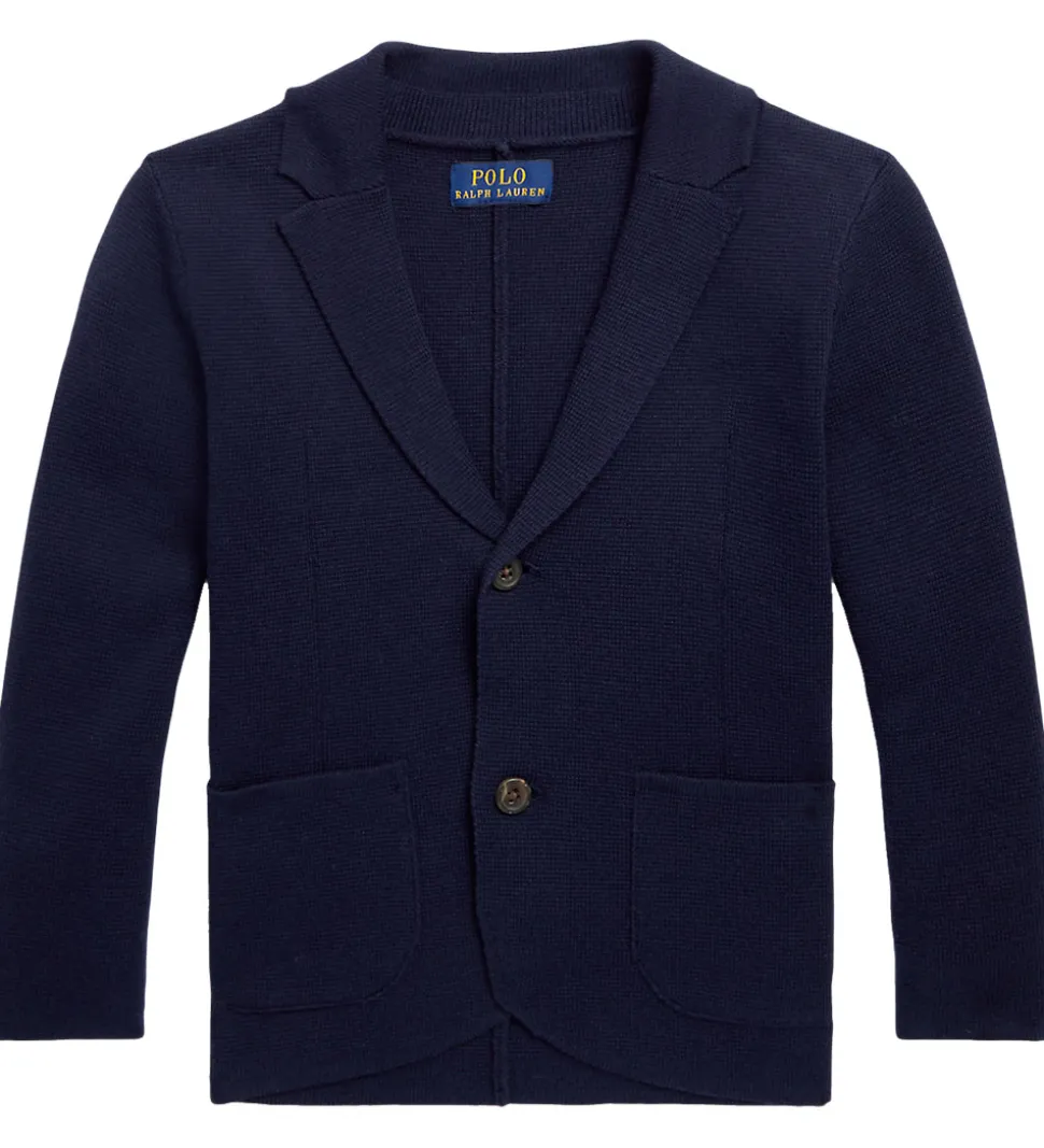 Polo Ralph Lauren cardiganen har et snit som en blazer med revers, og den lukkes med knapper. Fortil sidder der to lommer.