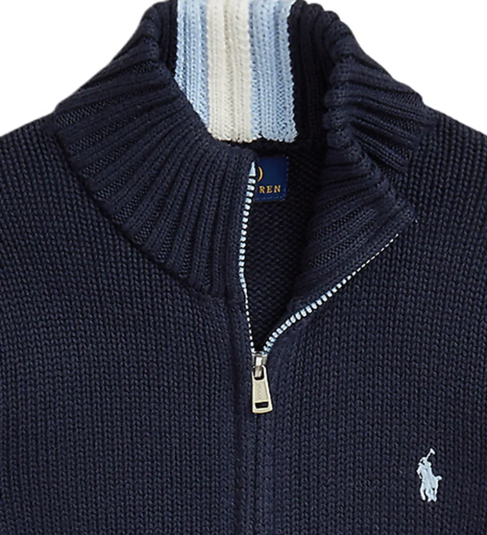 Flot cardigan fra Polo Ralph Lauren i navy bomuldsstrik, og i nakken er der hvide og lyesblå striber. Cardiganen har en høj hals, og den har brede ribkanter. Den åbnes med en skjult lynlås, og fortil sidder der to lommer.