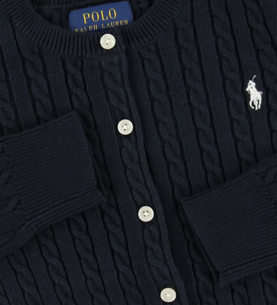 Sød Polo Ralph Lauren cardigan i en navy strikkvalitet, med et logo broderet i hvid i venstre side.