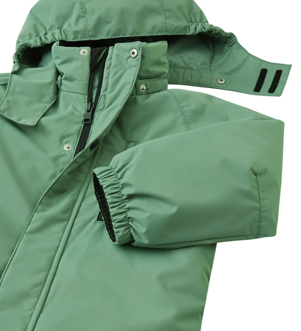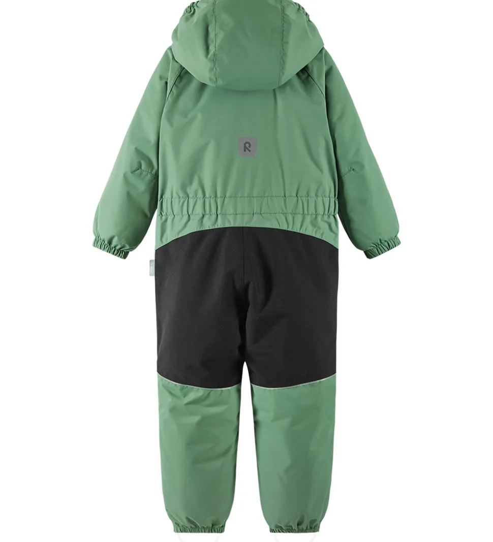 Fin Reima flyverdragt i grøn med sorte forstærkninger på knæ og siddeområde.