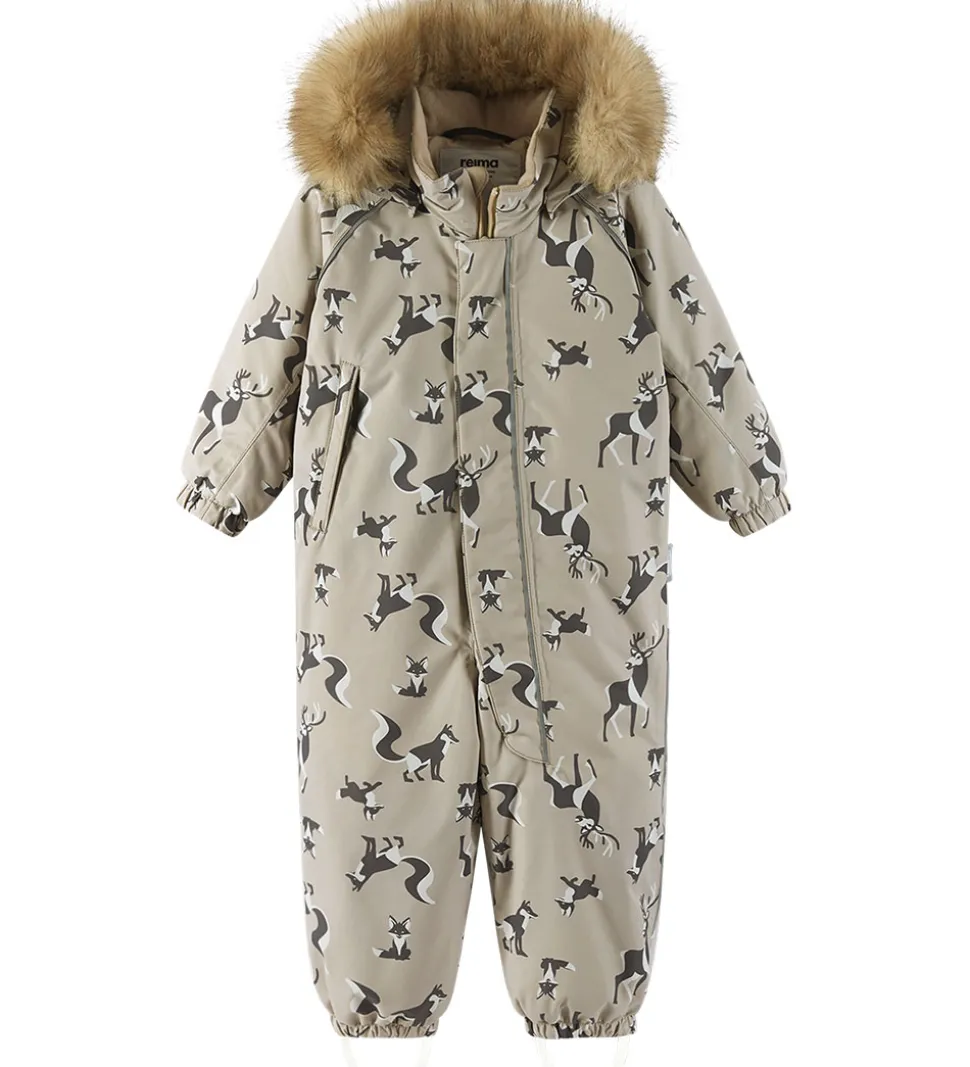 Smuk Reima flyverdragt i beige med et mørkt alloverprint af polardyr. Hætten har en flot kant af imiteret pels.