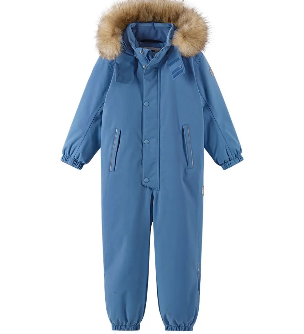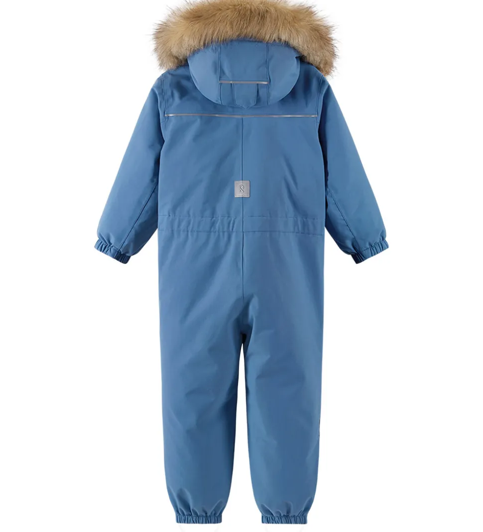 Sej Reima flyverdragt i ensartet, støvet blå, og hætten har en flot kant af imiteret pels.