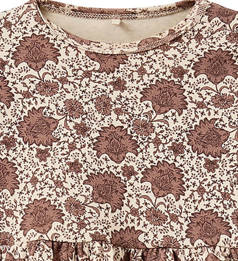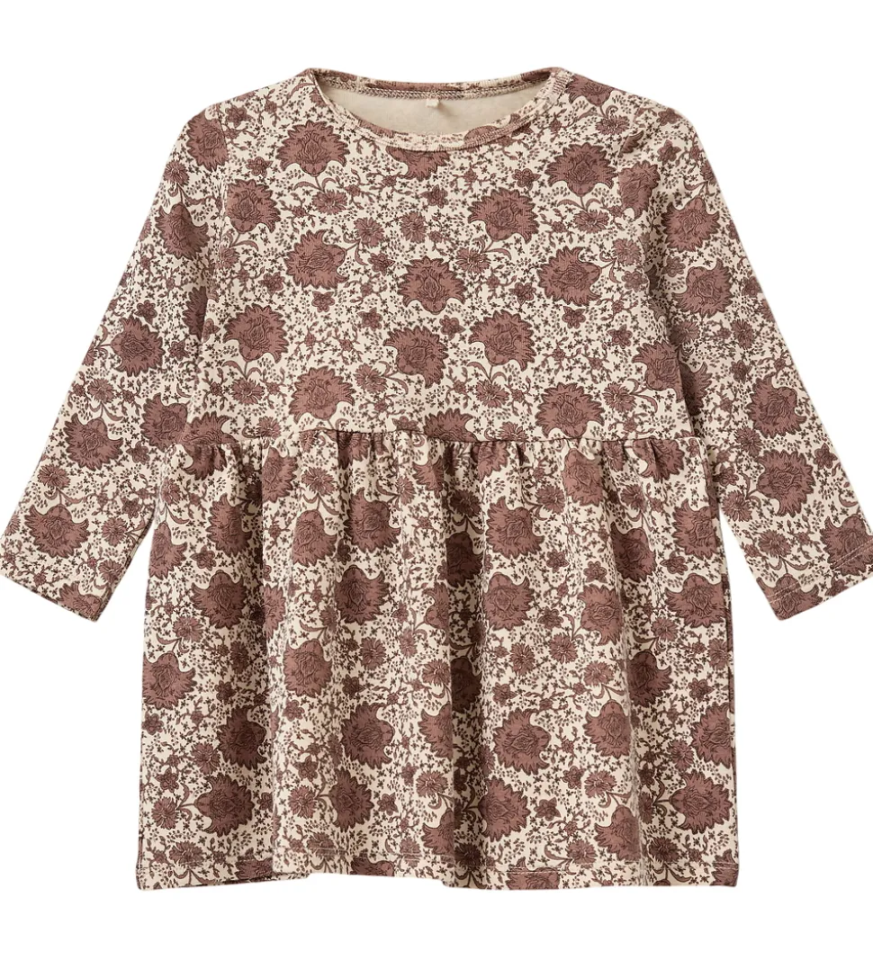 Elegant Sofie Schnoor kjole i beige med et mønster af støvet, mørkerosa blomster. Kjolen fra Sofie Schnoor har lange ærmer og en afrundet halsudskæring, der fuldender looket.