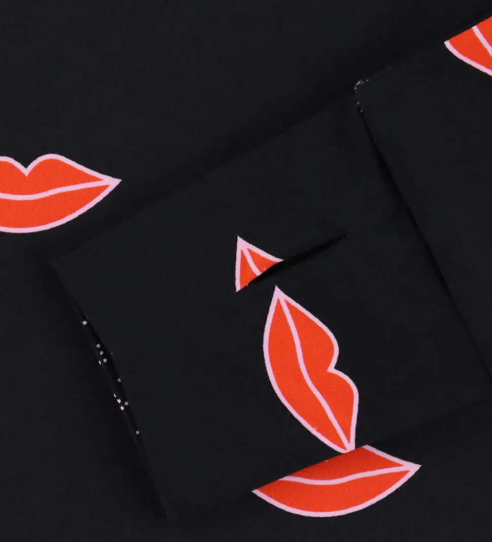 Sej Stella McCartney Kids badebluse i sort med et alloverprint med læber i rød og rosa.