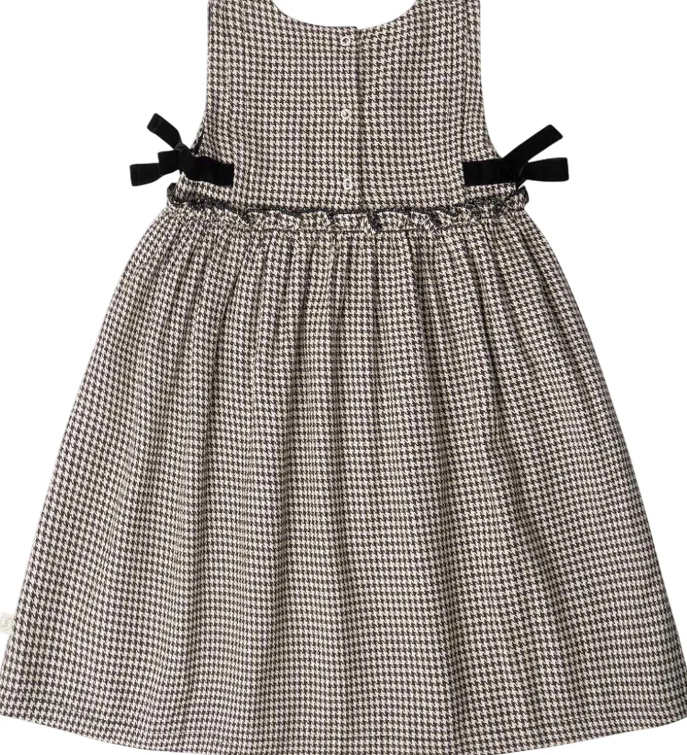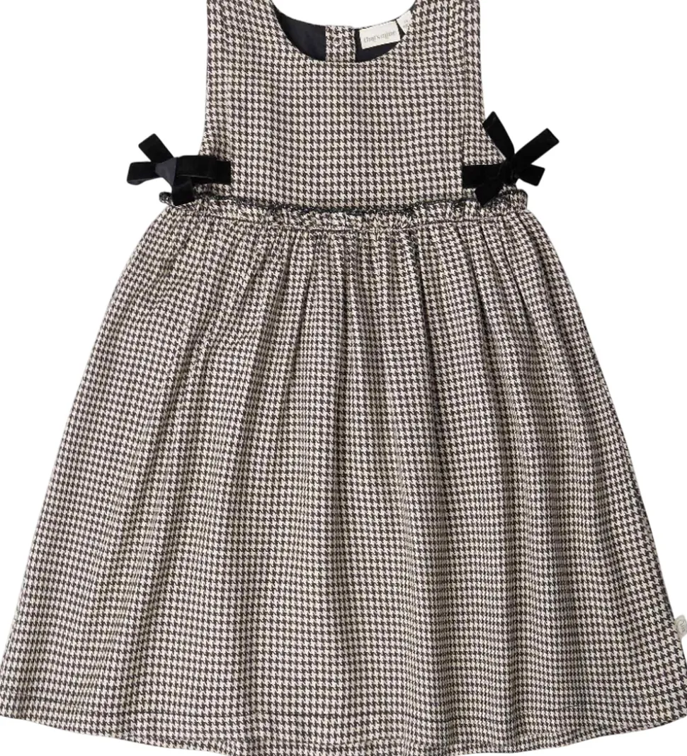 Elegant Thats Mine kjole med et klassisk hundetandsmønster i sort og hvid. Kjolen har brede stropper og er pyntet med sorte sløjfer i taljen. Skørtet har en let rynket effekt, som giver kjolen ekstra fylde. I ryggen åbnes kjolen med tre trykknapper, hvilket gør af- og påklædning lettere.