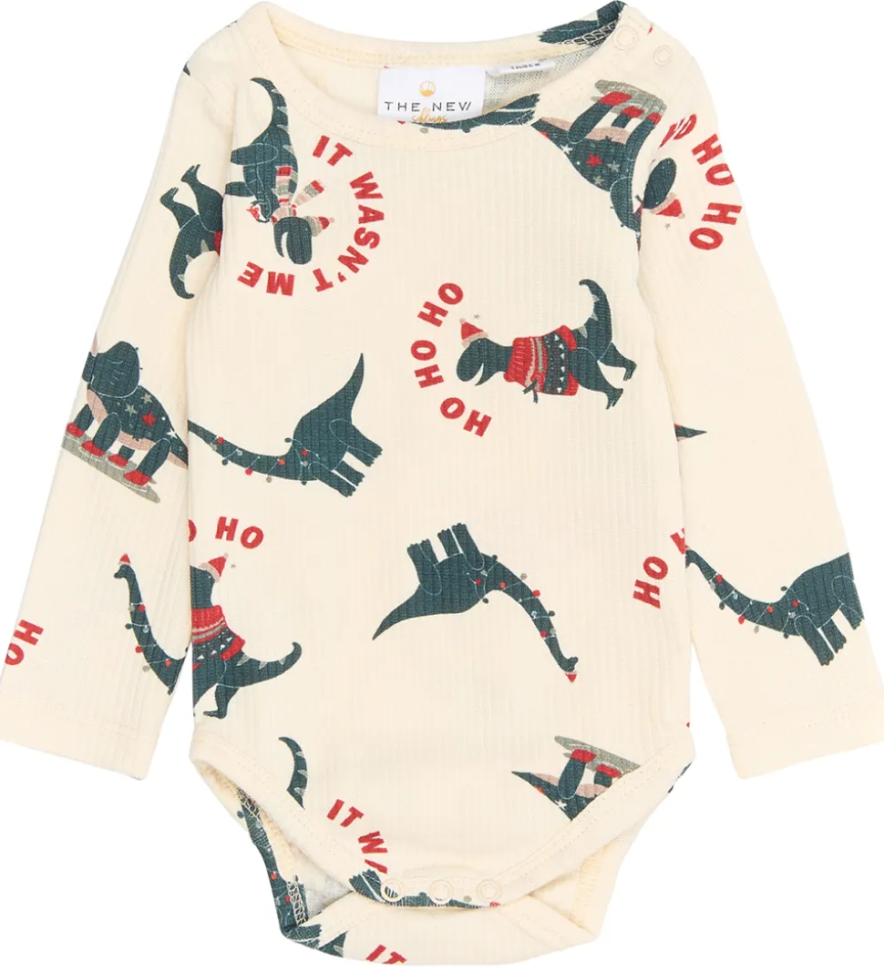 Charmerende The New body i cremehvid med lange ærmer og et sjovt dinosaurprint. Bodyen har farverige motiver og teksten “Ho Ho” og “It Wasn’t Me” spredt ud over stoffet. Ribstrukturen giver et stilfuldt look.