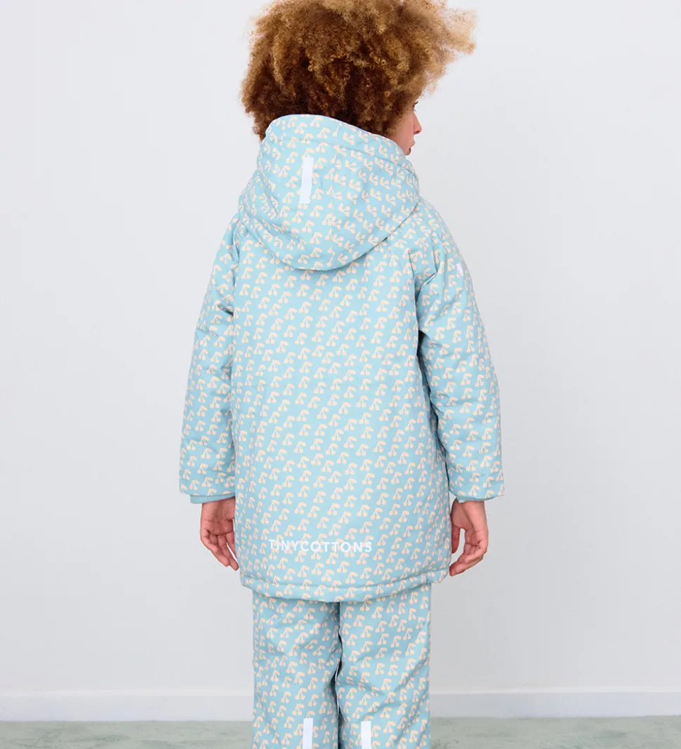 Sød Tiny Cottons vinterjakke i lyseblå med et flot alloverprint af hvide kirsebær.