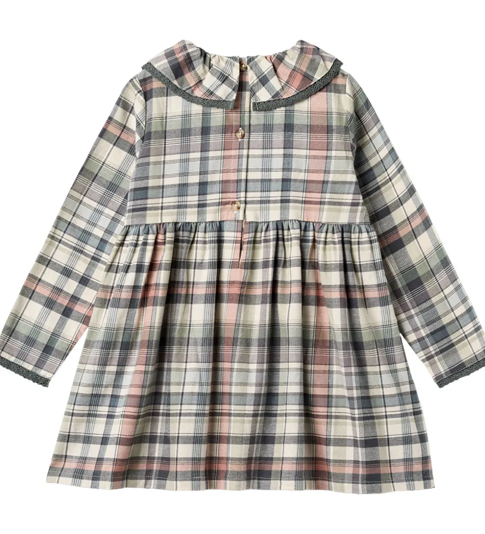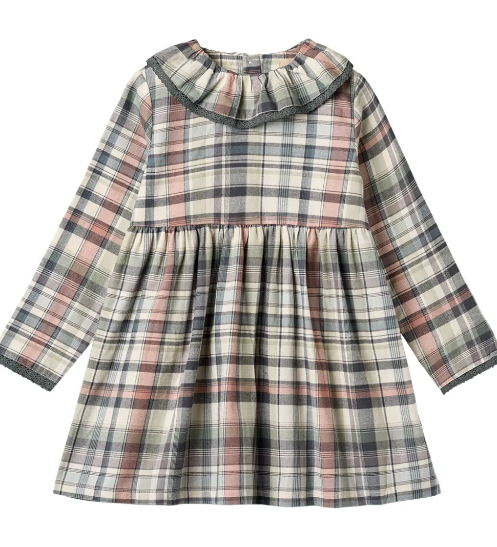 Flot Wheat kjole i et klassisk ternet mønster med støvede grønne, blå, rosa og cremehvide farver. Kjolen har lange ærmer og en elegant flæsekrave, der giver et stilfuldt udtryk. Strukturen er let og løs, hvilket giver et tidløst look og sikrer bevægelsesfrihed.