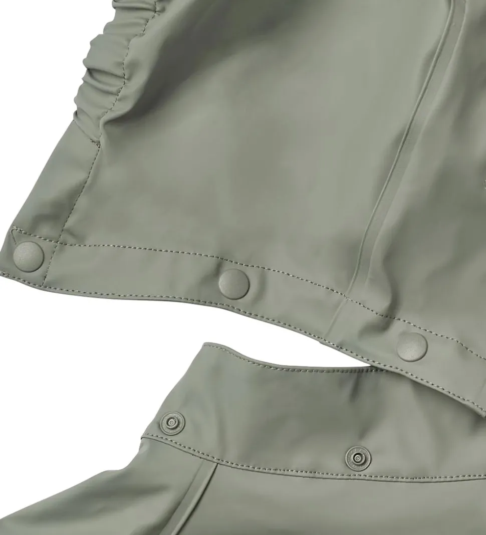 Wheat regnjakken har en aftagelig hætte, som fastgøres med trykknapper omkring halskraven, og har en elastikkant i toppen af ansigtsåbningen. På toppen af hovedet kan hætten justeres med en velcrostrop. Omkring håndleddene og i siderne af livåbningen er der elastikkanter. Regnjakken har skjulte, åbne lommer i siderne.