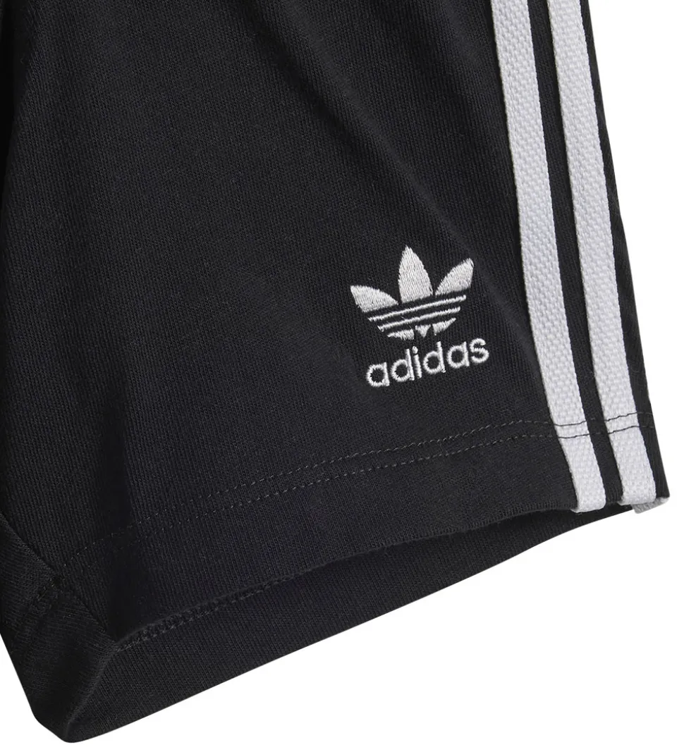 Smart adidas Originals shortssæt bestående af en hvid t-shirt med et stort, sort logoprint på fronten og et par sorte shorts med hvide striber langs siderne og et hvidt adidas-logo broderet på venstre ben.