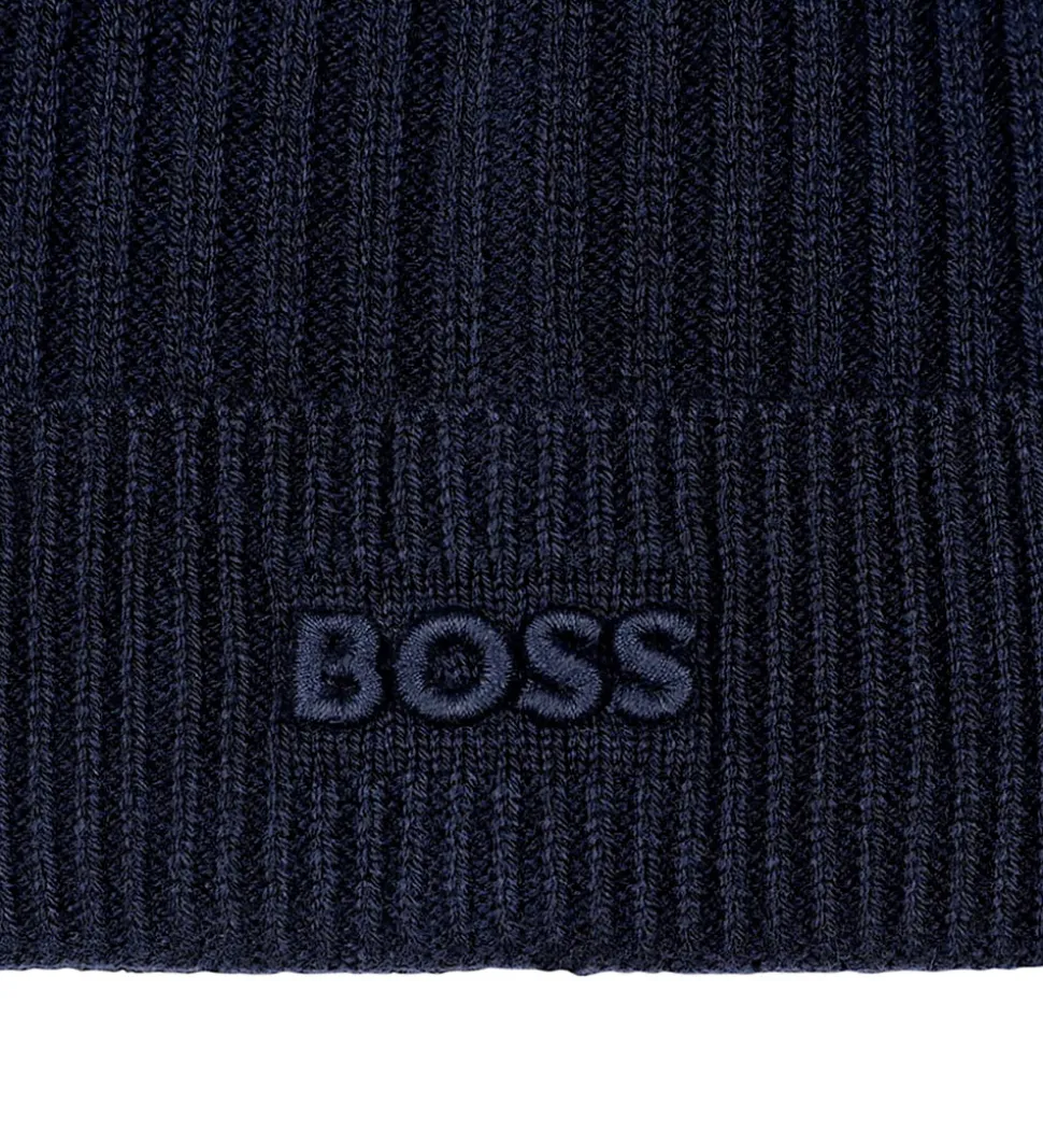 Fin BOSS hue i ensfarvet navy i en let strikket kvalitet med ribstruktur. Huen prydes af et diskret BOSS logo broderet på fronten. Huen har en rund hovedform og et bredt ombuk langs kanten.